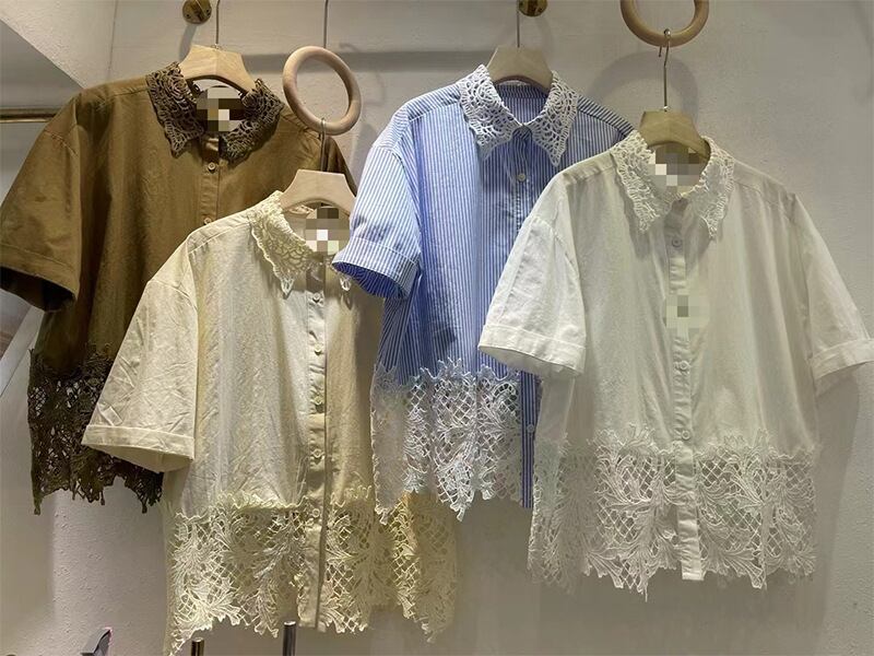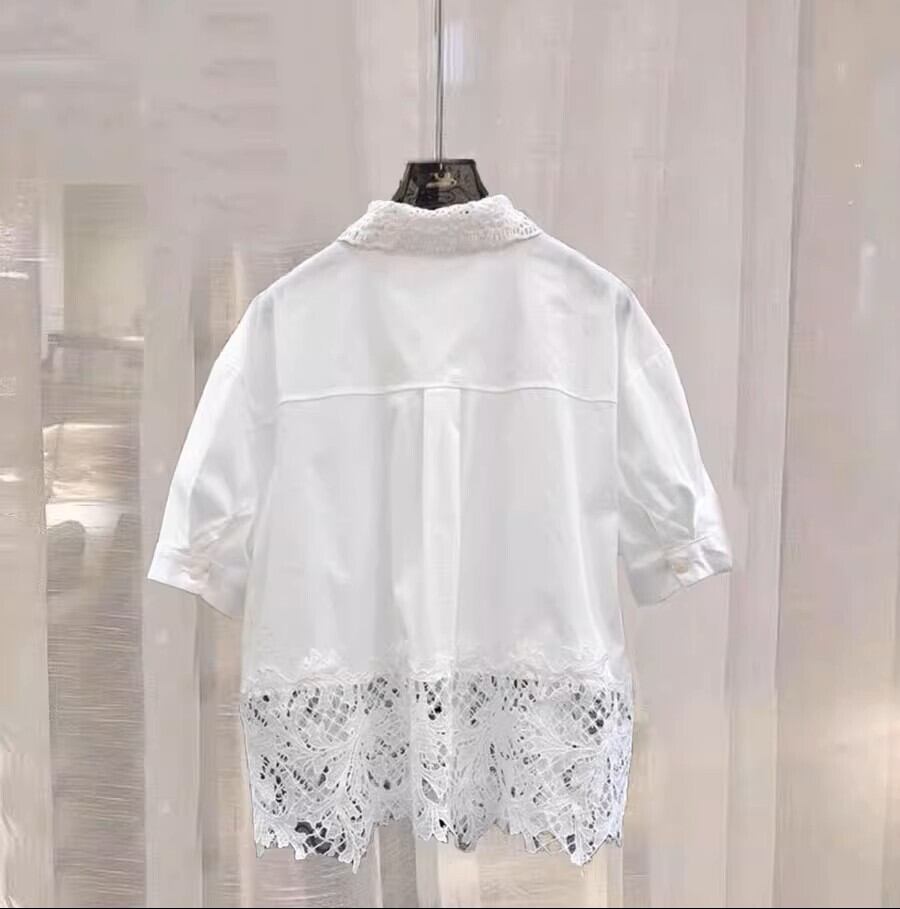 繊細なレースの切り替えと角襟が印象的な、上品でかわいい前開きシャツ。ゆったりシルエットで、夏の装いに軽やかさをプラスします。