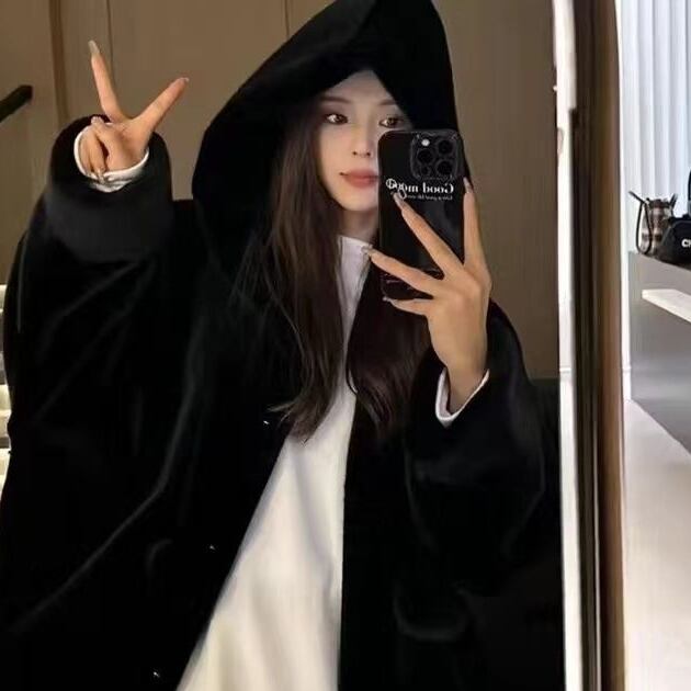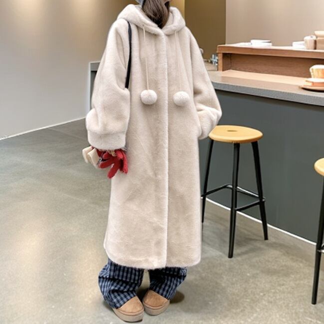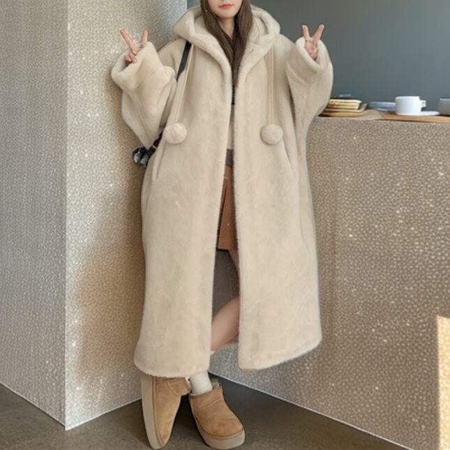 フードとふわふわ素材が、暖かさとリラックス感を演出し、カジュアルながらも上品な印象を与えます。