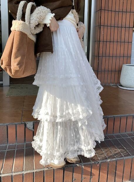 レディース スカート ロングスカート レーススカート ロング マキシ 丈長 フレア Aライン レース 刺繍 シフォン ふわふわ 中厚手 厚手 刺繡 ポリエステル かわいい シンプル ガーリー ラブリー キュート プリンセス ロマンティック 無地 冬 誕生日 発表会 クリスマス バレンタイン 学生 デート お出かけ イベント 女子会 休日 ショッピング お花見 着回し モテ 清楚 フリーサイズ 白 黒