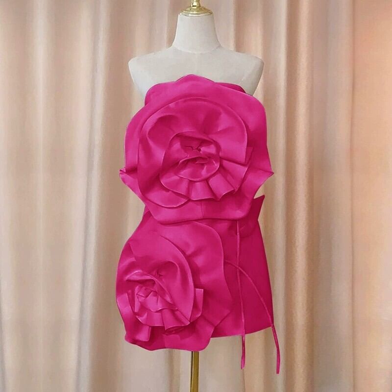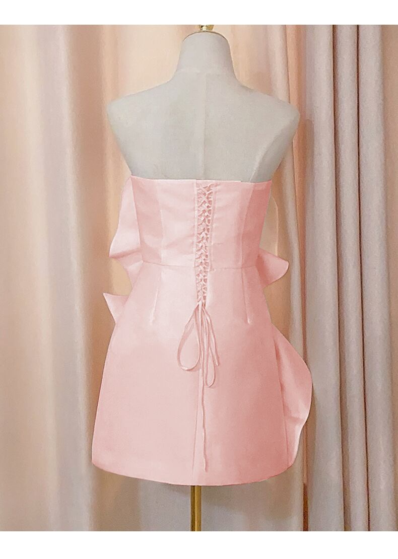 華やかなピンクが目を引く、女性らしさを引き立てるパーティードレスです。膝上丈のミニシルエットに、タイトさとセミフレアのバランスを取り入れ、スタイルアップを叶えながら動きやすさも兼ね備えています。袖なし・襟なしのシンプルデザインは、アクセサリーとの相性も抜群です。
