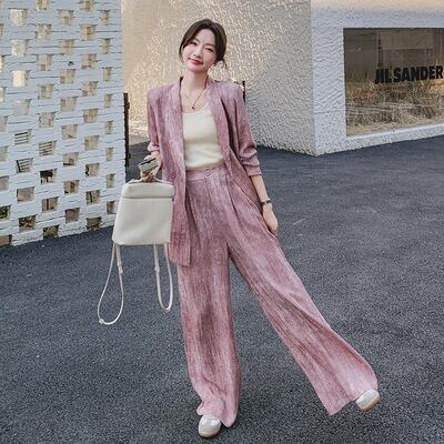 長袖の襟付きジャケットとハイウエストのロングワイドパンツがセットになっています。