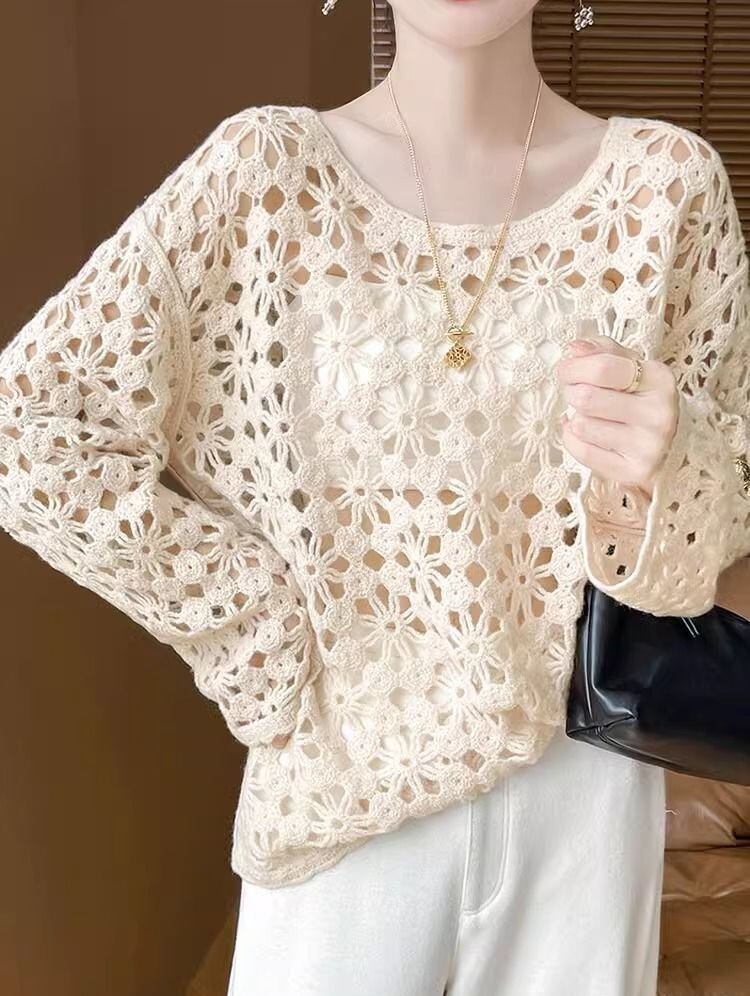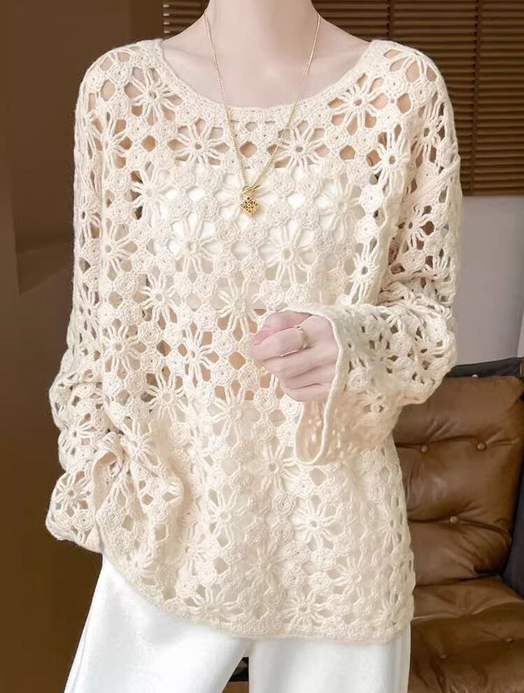 透かし編みが施されたラウンドネックのプルオーバーは、シンプルでありながら一際存在感があり、コーディネートを華やかに演出します。