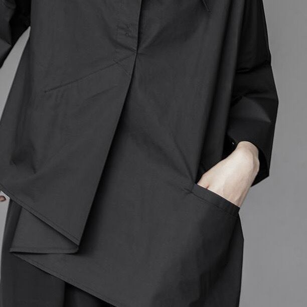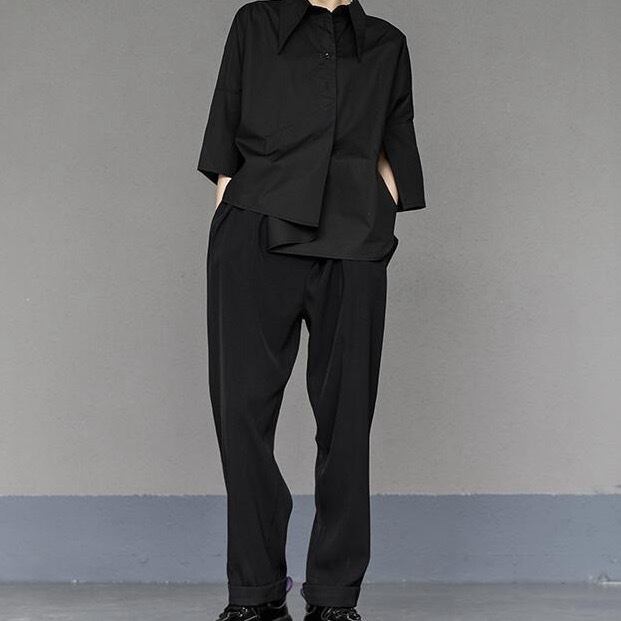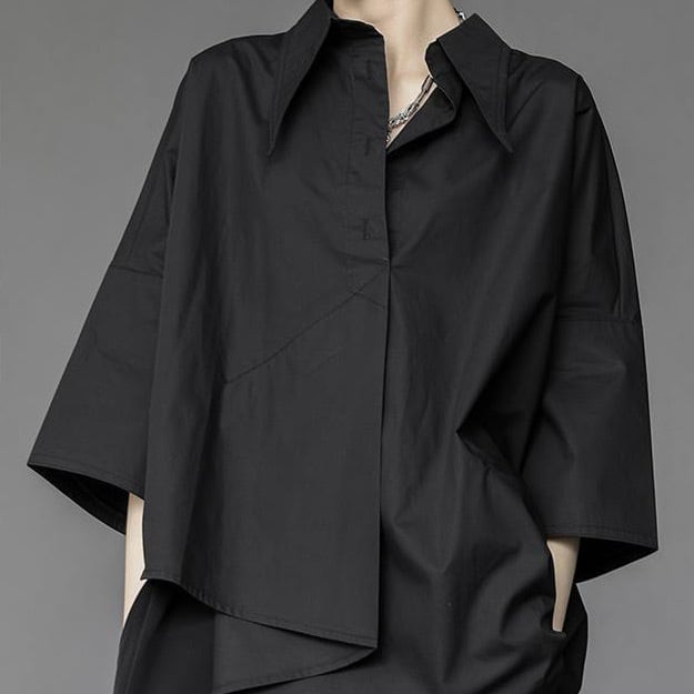 シックでスタイリッシュなアシンメトリーデザイン7分袖シャツ。