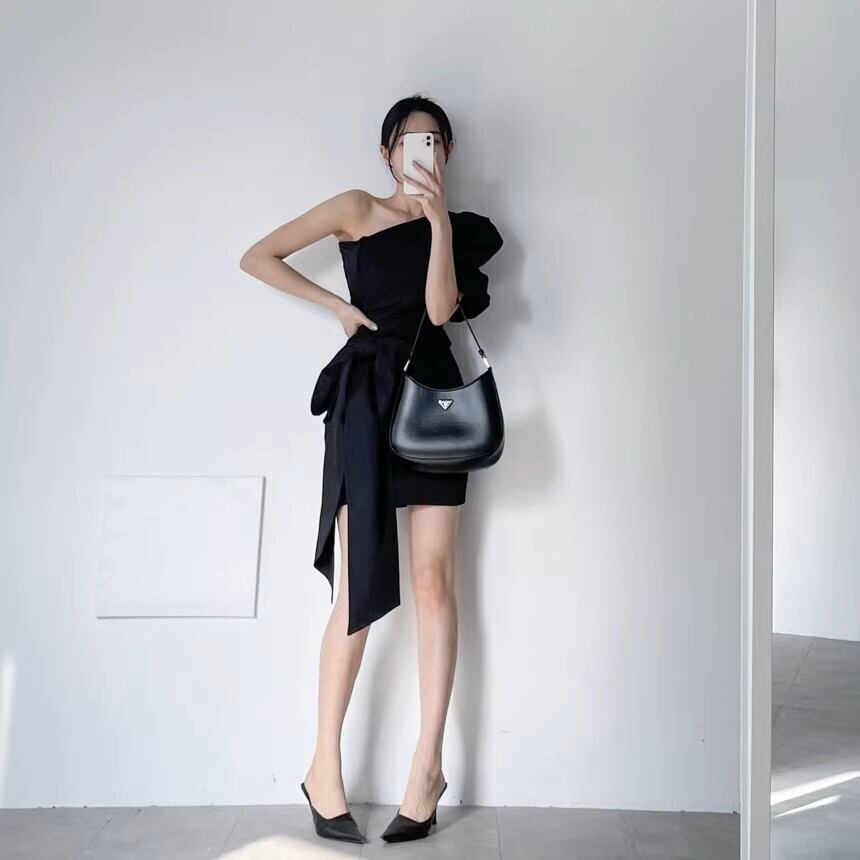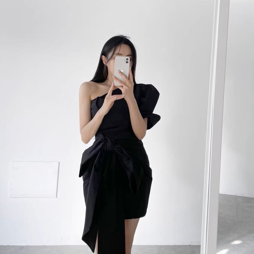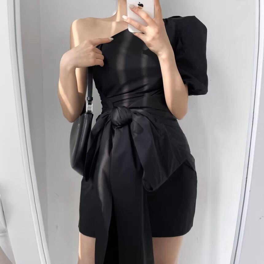 洗練されたブラックのワンショルダーワンピースです。膝上丈のミニシルエットにタイトなラインを組み合わせ、スタイルを美しく引き立てます。ウエストリボンのアクセントが女性らしいフェミニンさをプラスし、メリハリのあるシルエットを演出します。