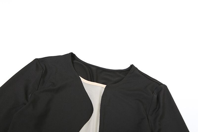 エレガントな黒のボディスーツに、胸元の大胆なカッティングが印象的なデザイン。曲線的なカットラインが女性らしいシルエットを際立たせ、洗練された大人の雰囲気を演出します。