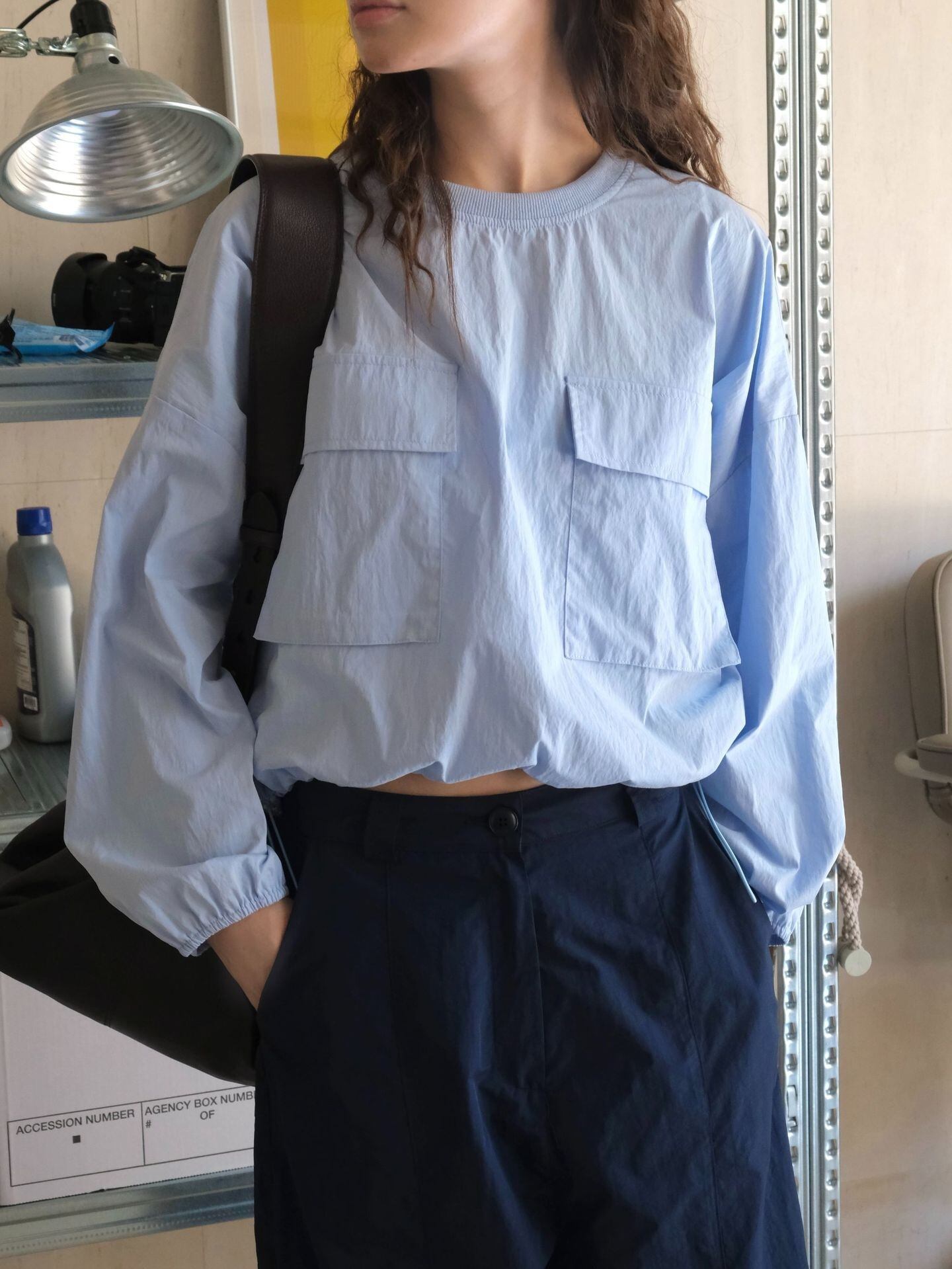 トップス シャツ 長袖 ボリューム袖 クルーネック ショート丈 ドロスト 胸ポケット 薄手 かわいい 可愛い 大人可愛い きれいめ シンプル 上品 レトロ おしゃれ かっこいい カジュアル こなれ感 個性的 主役級 存在感 抜け感 春 夏 ベーシック ナチュラル クール メンズライク 無地 女性用 レディース ママ OL 通勤 オフィス 学生 通学 デート お出かけ お泊まり 女子会 旅行 休日 カフェ ショッピング コンパ イベント 普段使い デイリー 着回し 重ね着 S M トレンド モテ