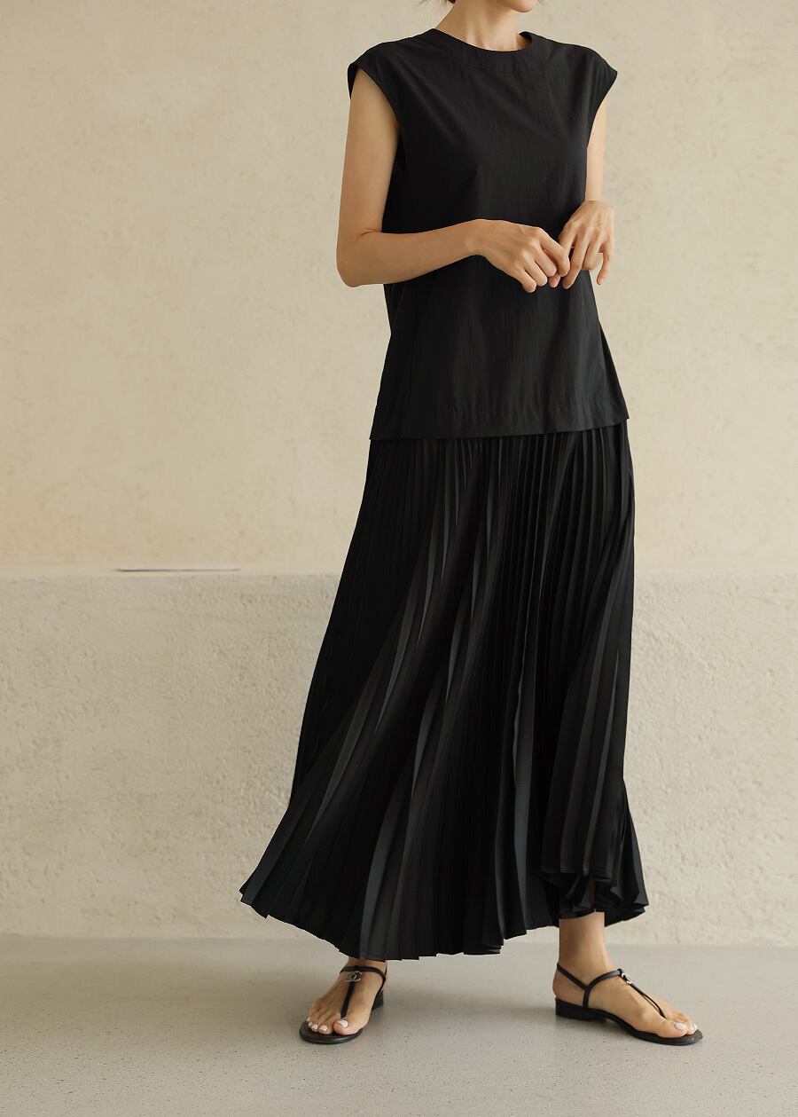 エレガントなクルーネックと切り替えデザインに加え、プリーツスカートがこなれ感を演出。