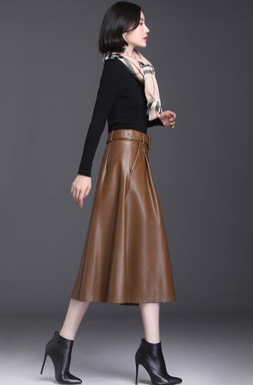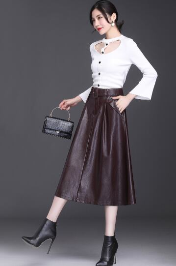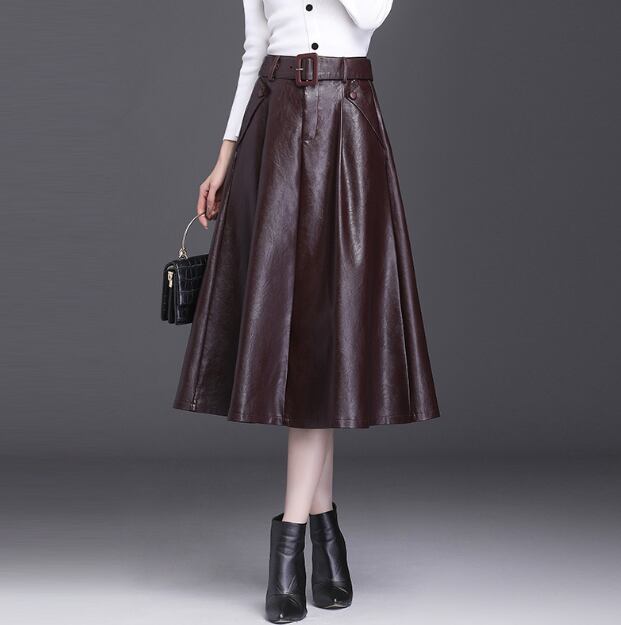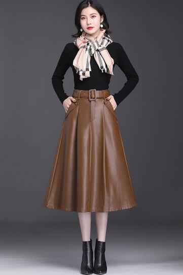 レディース スカート 膝丈 膝下 Aライン ベルト ウエストマーク ポケット ポリエステル PUレザー かわいい 大人可愛い シンプル 上品 おしゃれ レトロ こなれ感 ガーリー かっちり 学生風 ロマンティック 無地 秋 冬 ハロウィン クリスマス バレンタイン デート お出かけ レストラン 女子会 休日 ホテル ショッピング カフェ 韓国 オルチャン 定番 M L XL 2XL 3XL 4XL 黒 茶色 深緑 クラレット