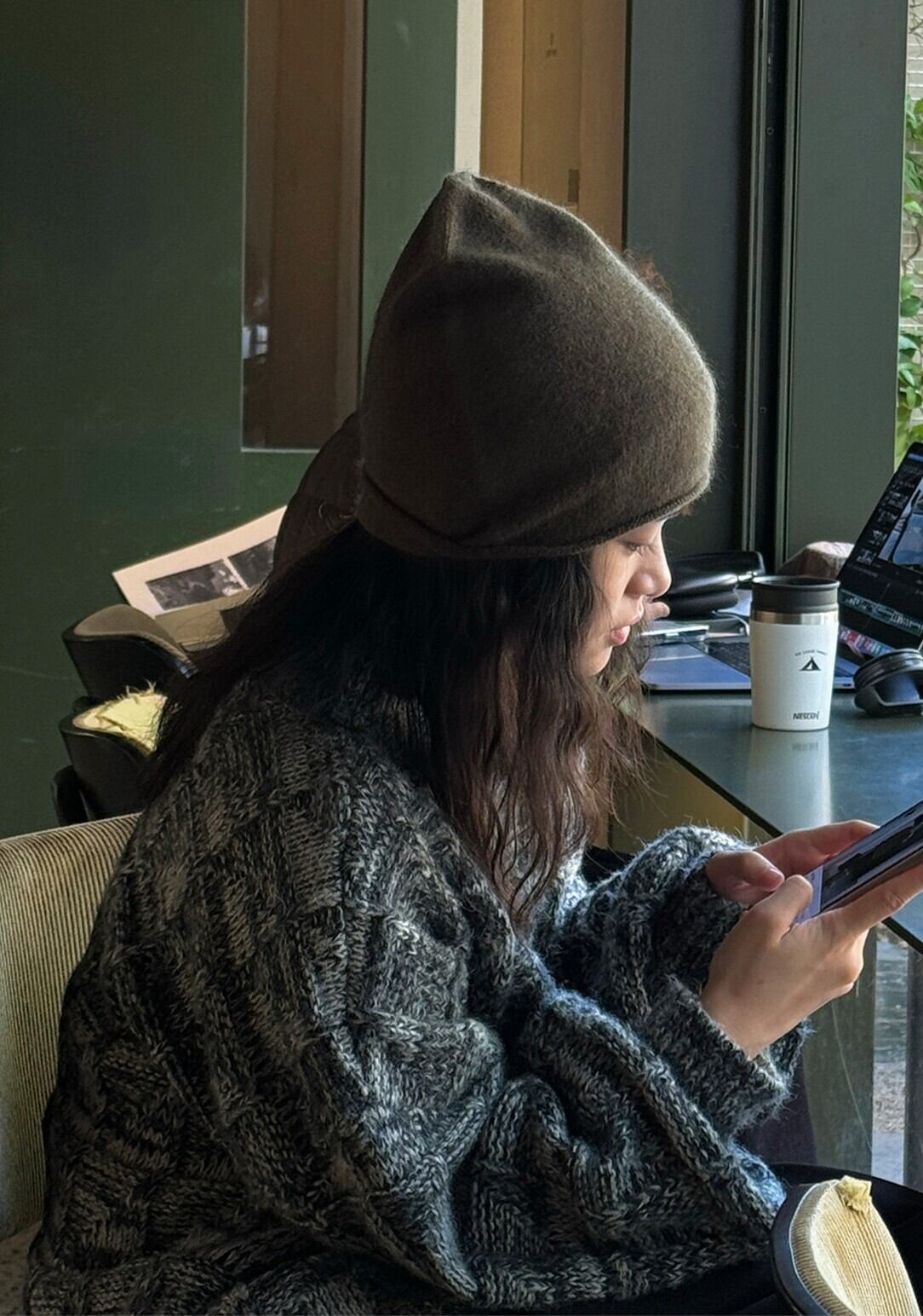 頭の形に自然に沿うような、丸みのあるシルエットで、被るだけで優しい雰囲気を演出します。折り返し部分を広げれば、耳まですっぽりと覆うことができるので、寒い季節にも暖かくお過ごしいただけます。