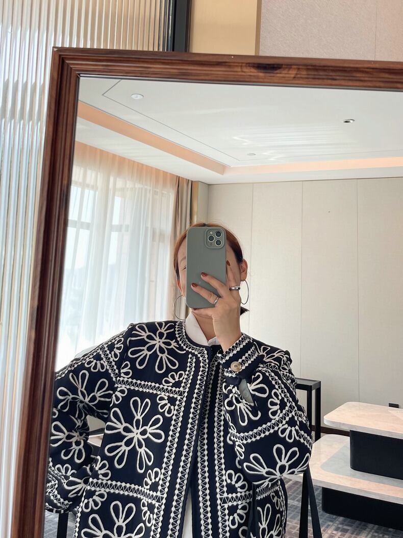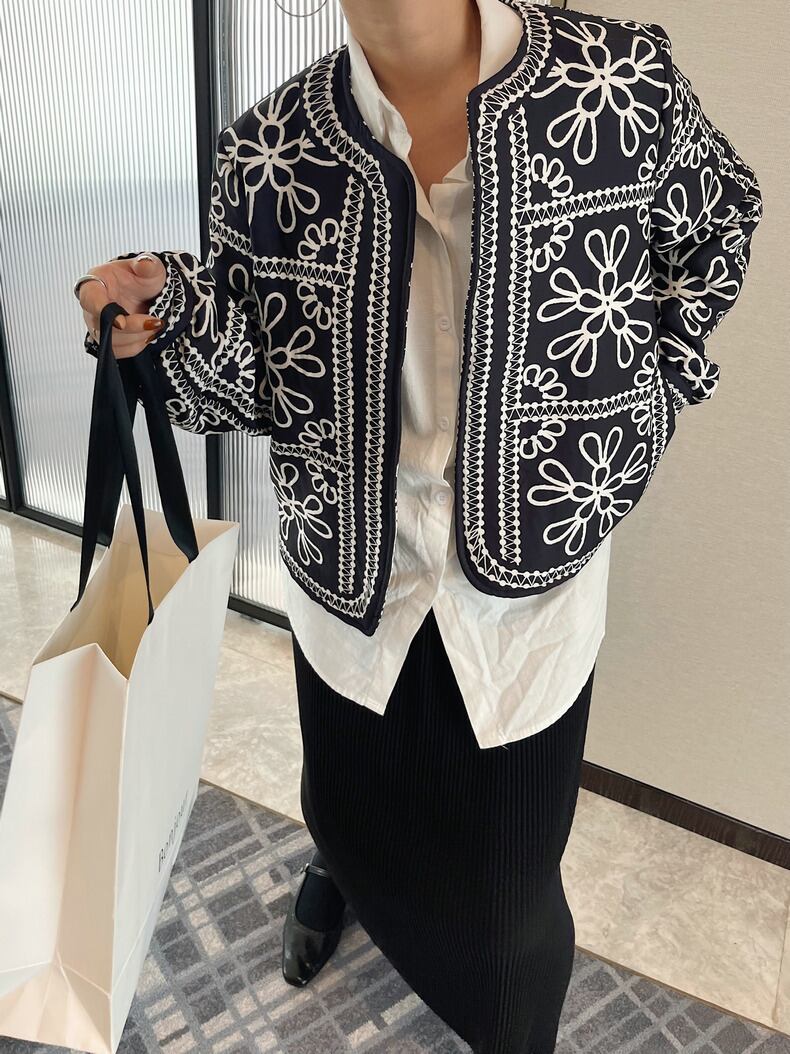 黒地に白い刺繍が映える、ノーカラーのショート丈ジャケット。