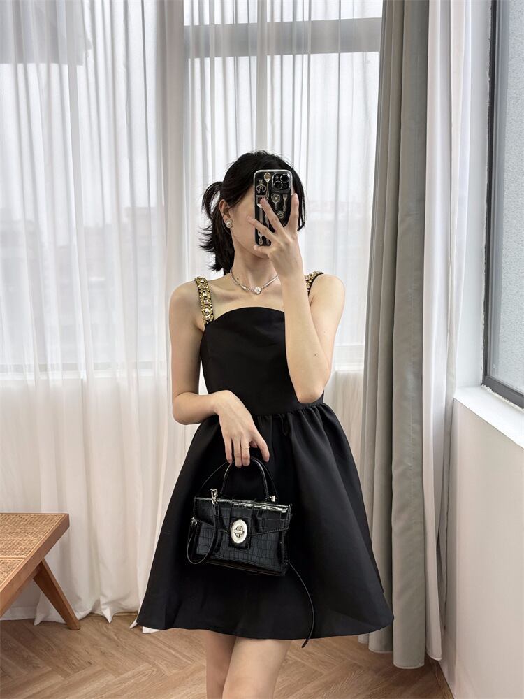 美しい光沢を放つ上質な生地が、動くたびに上品なドレープを描きます。特に注目すべきは、キラキラと輝くビジューがあしらわれたショルダーストラップ。肩を美しく見せつつ、顔周りを華やかに彩り、パーティーや特別な日の一着として、ひときわ目を引く存在感を放ちます。