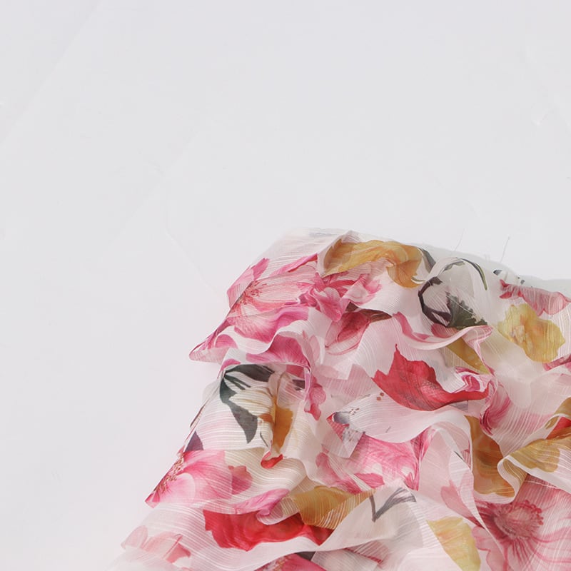 幾重にも重ねられた繊細なフリルが、歩くたびにドラマチックな動きを生み出し、まるで花びらが舞うかのような優雅なシルエットを演出します。胸元から足元まで続くティアードフリルは、視覚的に縦のラインを強調し、スタイルアップ効果も期待できます。