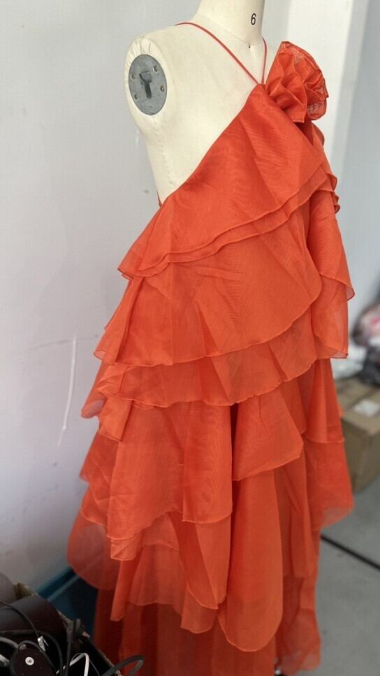 幾重にも重なったフリルが、まるで大きな花びらのように見えるデザインが特徴です。