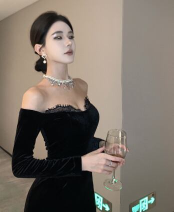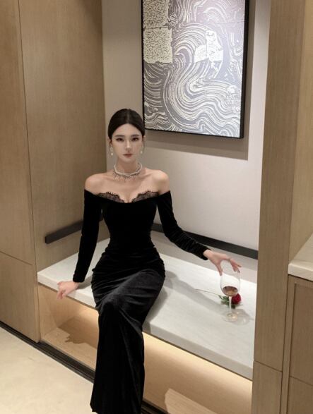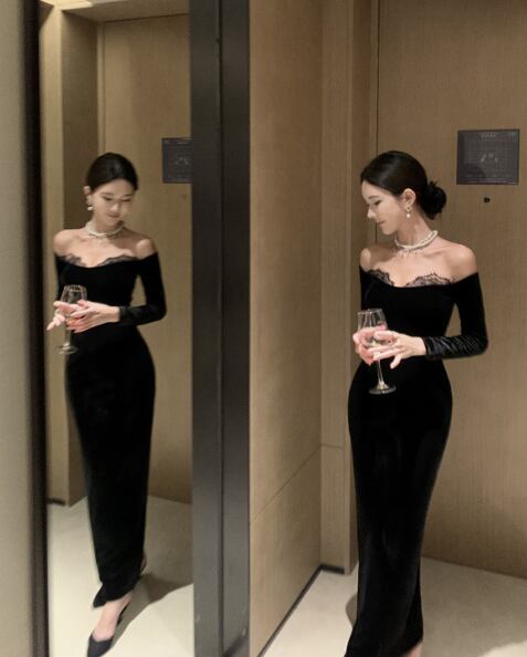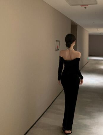 ロング丈のタイトなシルエットと、オフショルダーデザインが、洗練された印象を与えます。