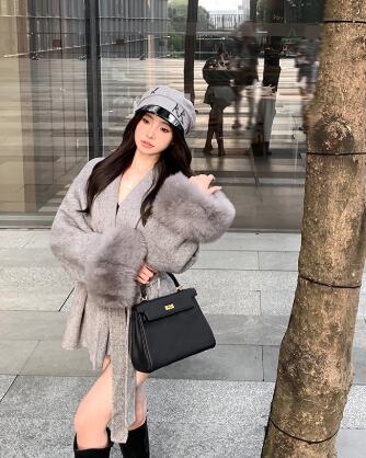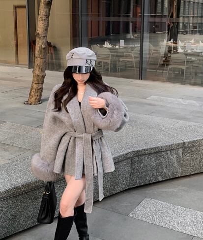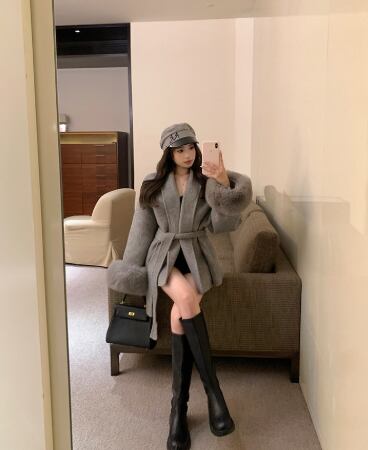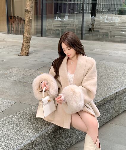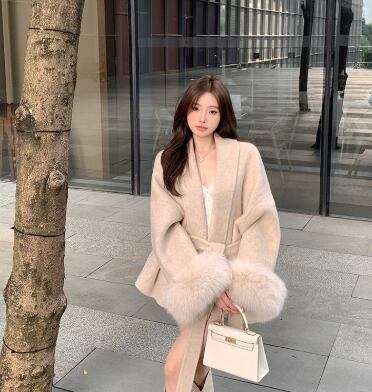 袖もとにあしらわれているファーがアクセントになっていて、Vネックデザインがシンプルながらも上品なアイテムです。