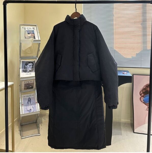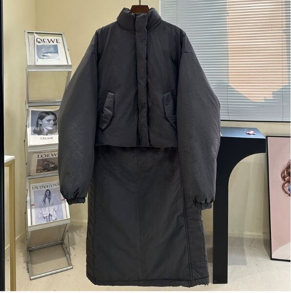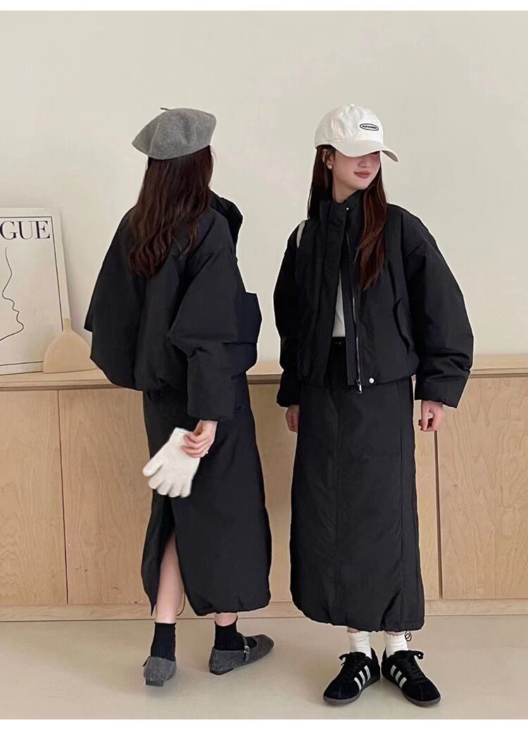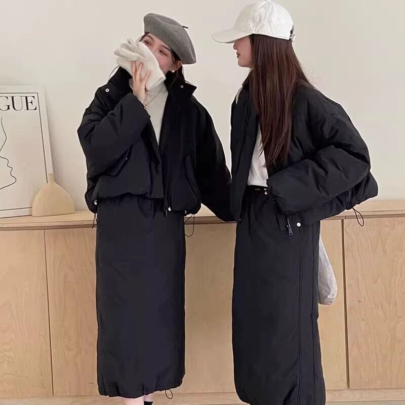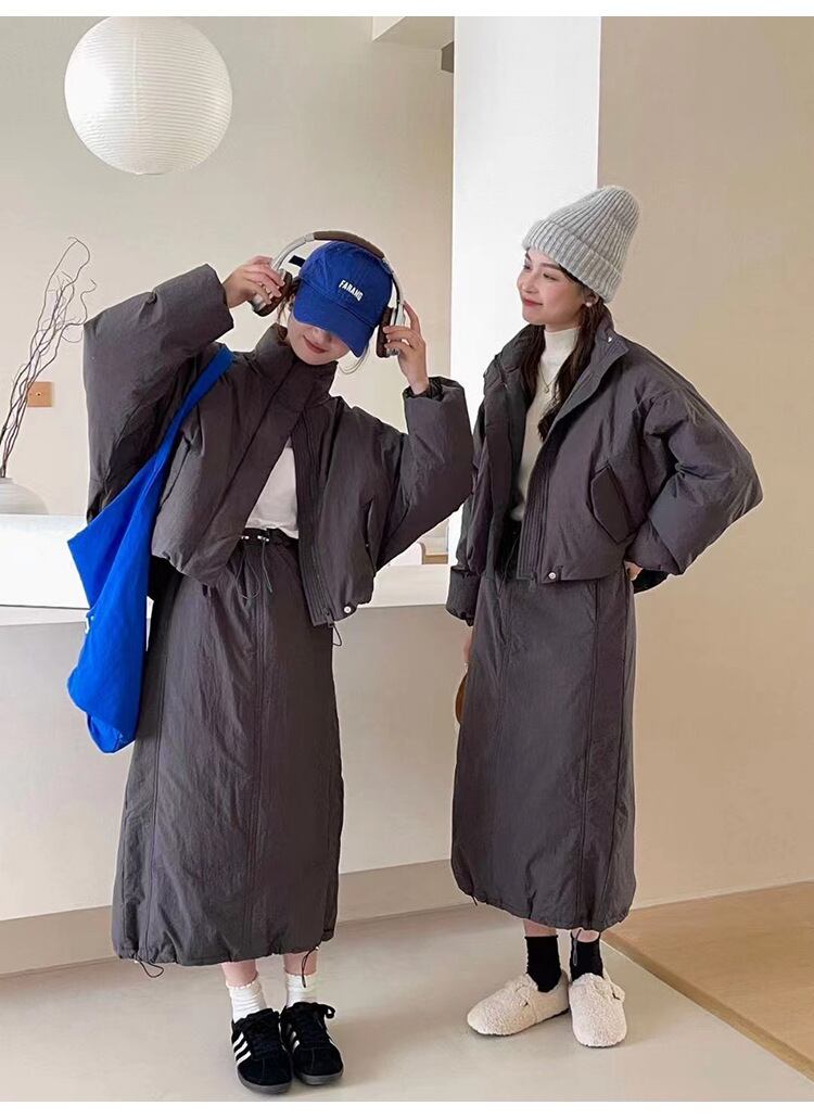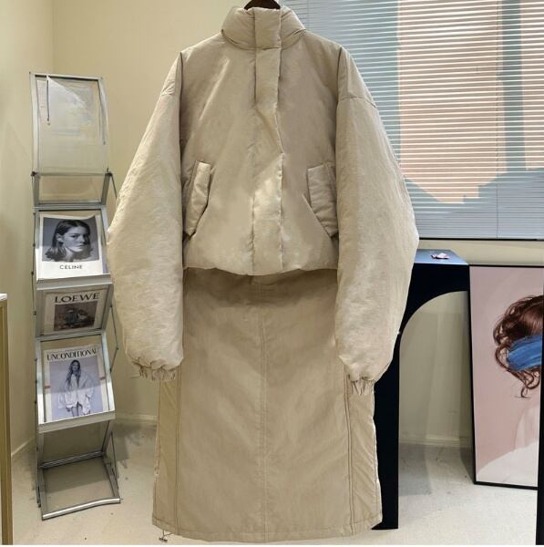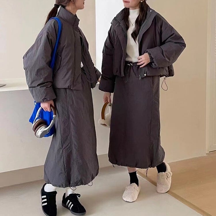 レディース スカート ジャケット ボトムス セットアップ アウター 上着 前開き ミディアム ダウンジャケット ロングスカート 膝下 ミモレ ロング 長袖 ドロップショルダー スタンドカラー Iライン ドロスト かわいい 大人可愛い シンプル カジュアル おしゃれ かっこいい こなれ感 ラフ クール 無地 秋 冬 ママ 学生 学校 通学 デート お出かけ アウトドア 旅行 公園 女子会 休日 ショッピング モノトーン コーデ 楽ちん 暖かい 防寒 普段使い 着回し M L 黒 茶色 グレー オフホワイト