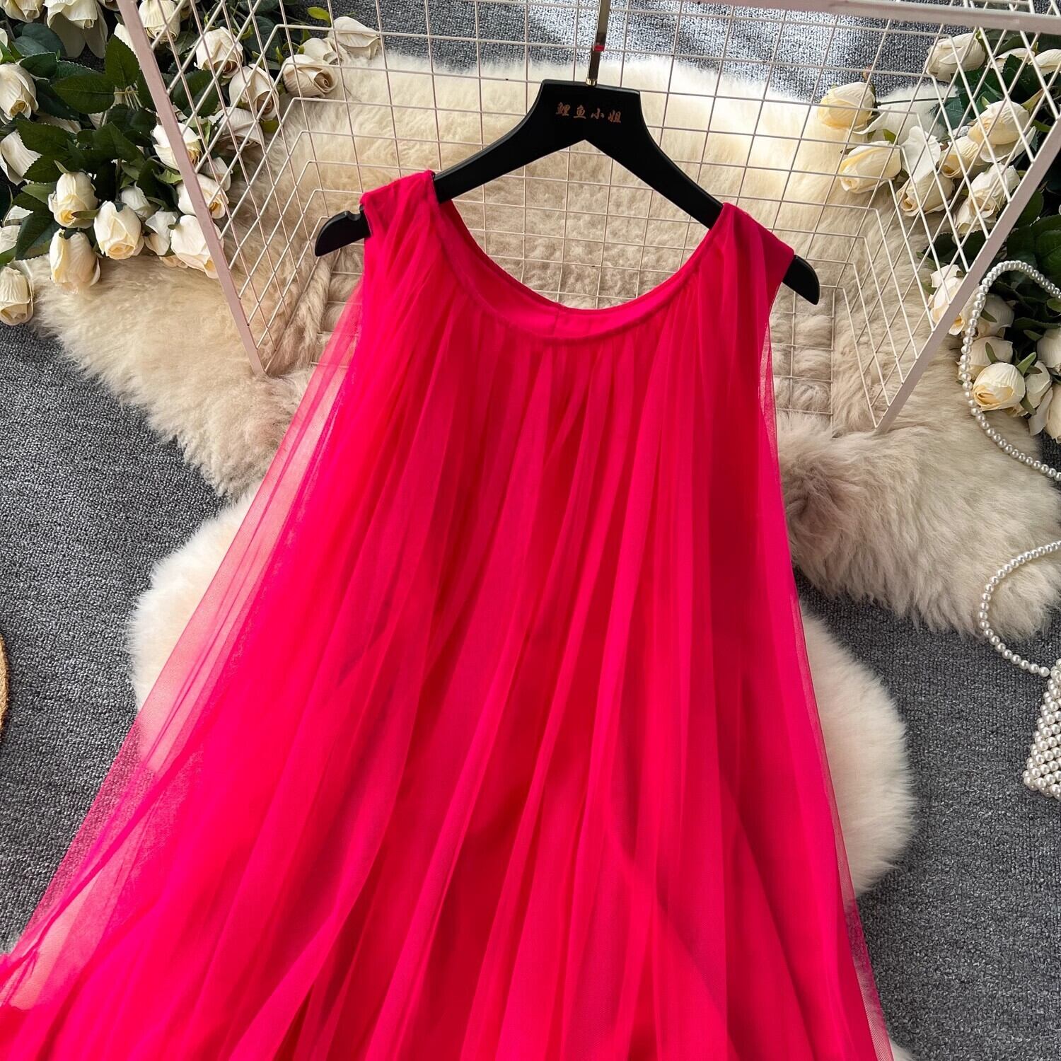 軽やかなフレアシルエットが魅力の、ノースリーブワンピースです。ラウンドネックのシンプルなデザインが顔まわりをすっきり見せ、上品でフェミニンな印象を引き立てます。