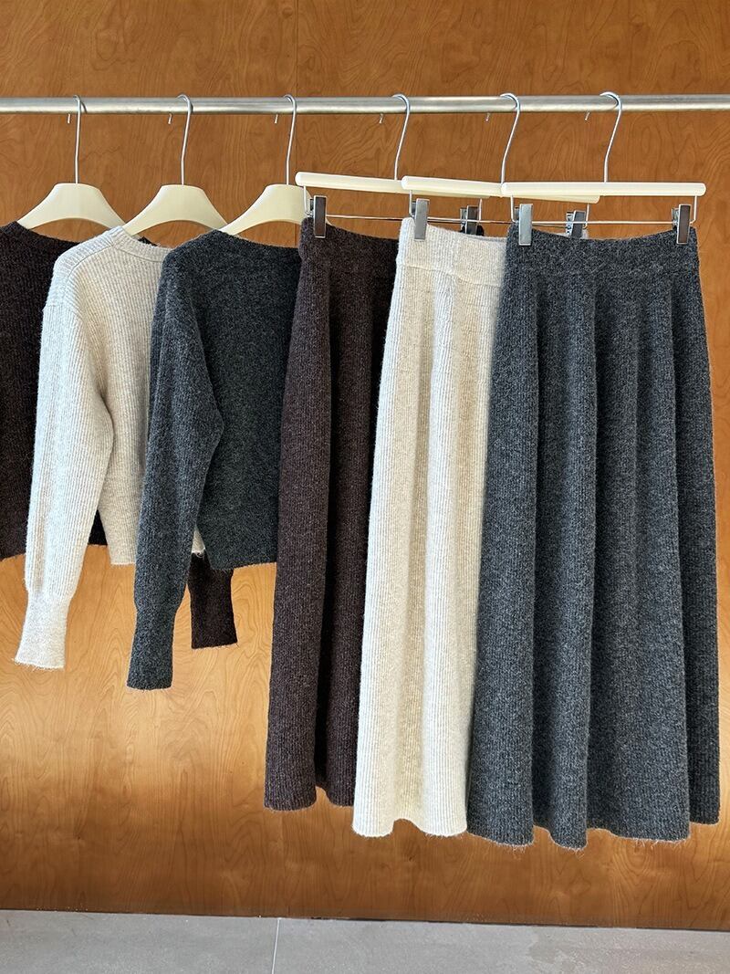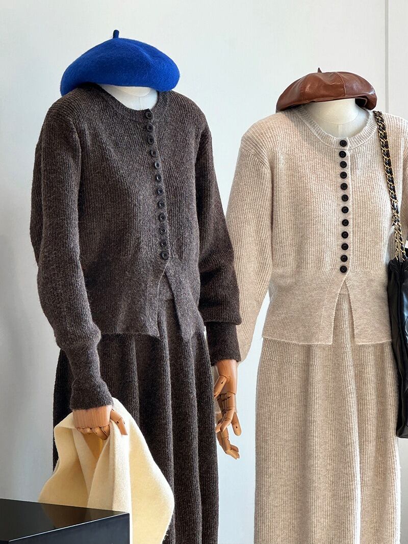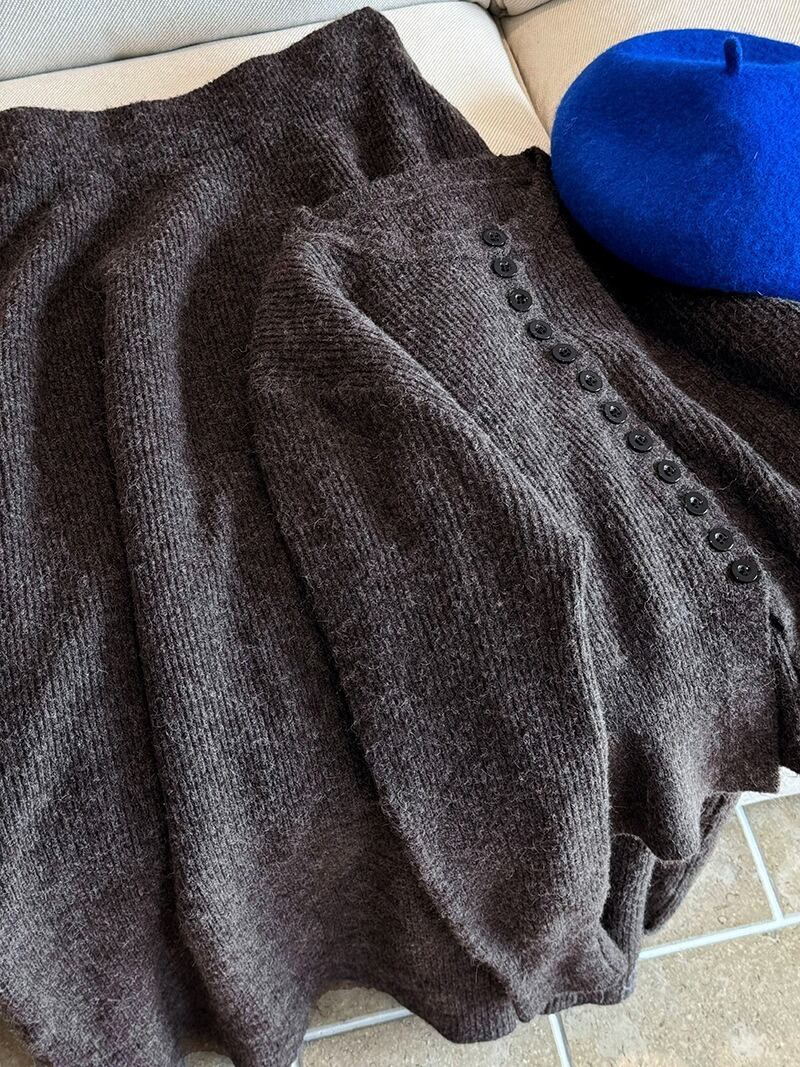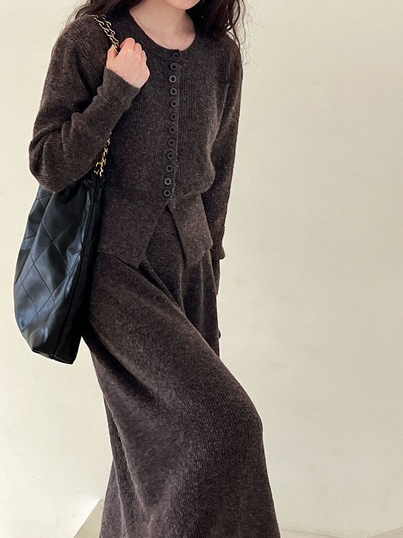 2点セット レディース スカート トップス ニット ロング 長袖 ボタン 大人可愛い きれいめ おしゃれ かっこいい ラフ ガーリー クール ナチュラル 無地 春 秋 通勤 デート お出かけ お泊まり イベント 旅行 レストラン 公園 女子会 休日 ホテル ショッピング コンサート ライブ カフェ 韓国 コーデ 楽ちん プレゼント 普段使い 着回し 清楚 インスタ映え フリーサイズ ブラウン ダークグレー ベージュ ライトブラウン