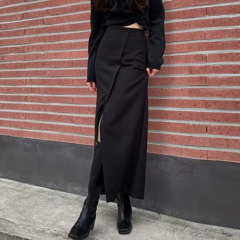 レディース スカート ロングスカート ロング Aライン アシンメトリー スリット ハイウエスト TR生地 スプライシング シンプル カジュアル おしゃれ 個性的 存在感 無地 春 夏 秋 ロングシーズン オフィス OL 通勤 お出かけ イベント 旅行 女子会 休日 バカンス ショッピング 体型カバー 普段使い S M L ブラック グレー