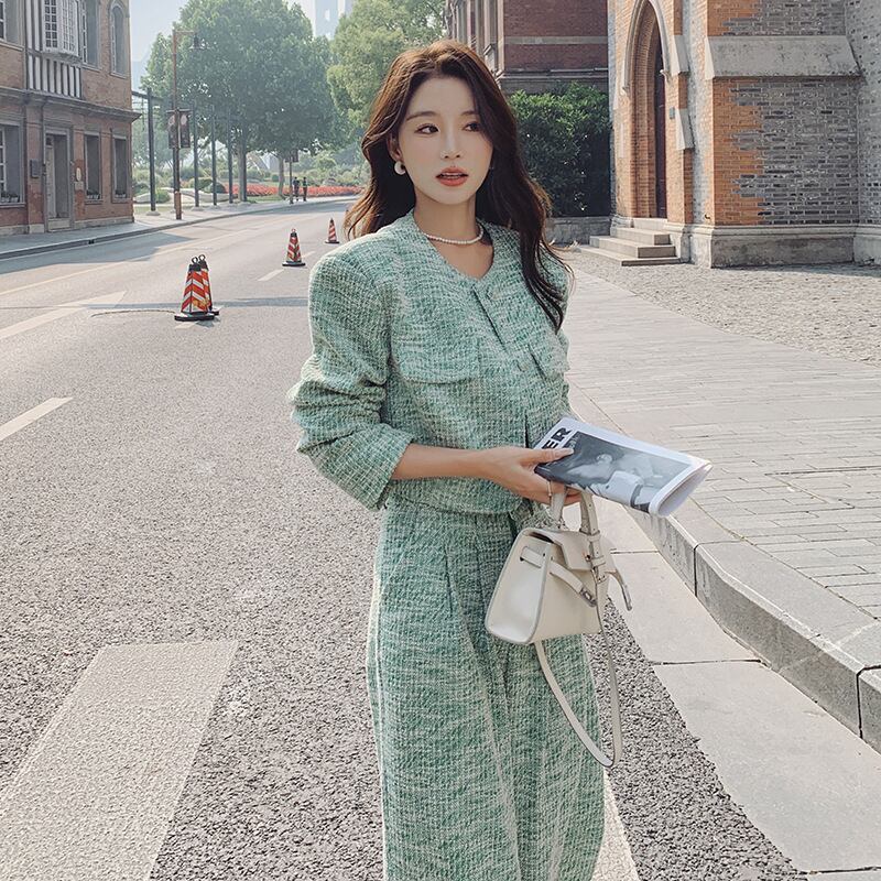 レディース ジャケット パンツ ショートジャケット ロングパンツ ツーピース ショート ロング 長袖 レギュラースリーブ ノーカラー ストレート ポケット ハイウエスト フレンチジャケット ワイドレッグパンツ ポリエステル繊維 大人可愛い カジュアル おしゃれ レトロ 個性的 存在感 無地 春 秋 ロングシーズン オフィス ビジネス OL 通勤 お出かけ イベント リゾート 旅行 女子会 休日 バカンス 普段使い S M L XL ゆったり グリーン