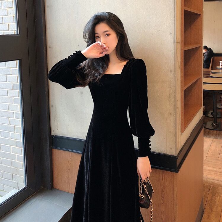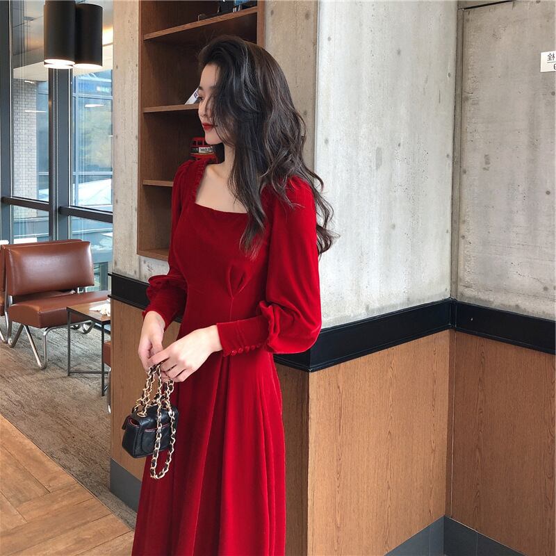 ドレス ワンピース パーティー 演奏会 発表会 膝下 長袖 ロングカフス スクエアネック Aライン プリーツ ハイウエスト ベルベット シンプル 大人可愛い おしゃれ レトロ 存在感 フォーマル エレガント 無地 パーティー イベント レストラン 春 秋 ロングシーズン S M L XL 黒 赤