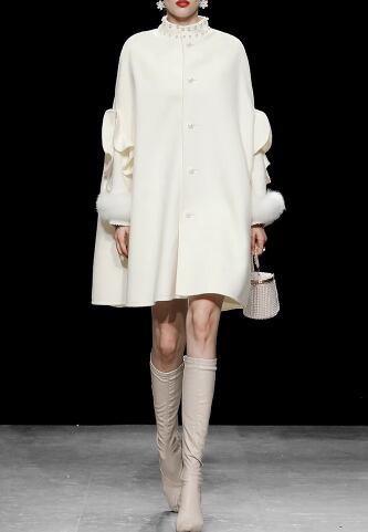 フリルがあしらわれているボリューム袖が特徴的なこのコートは、ハイネックデザインで温かさもバッチリ。