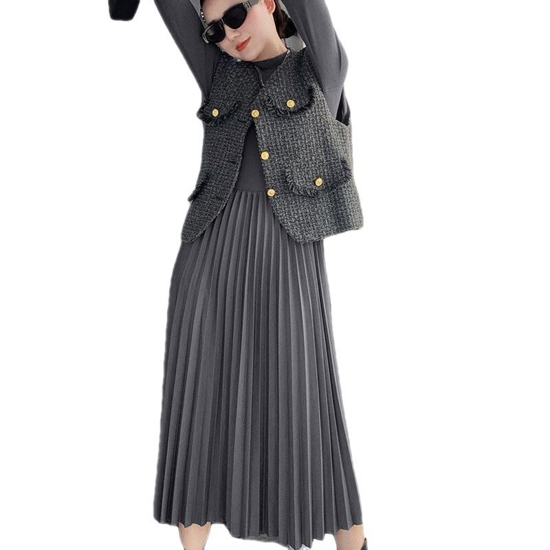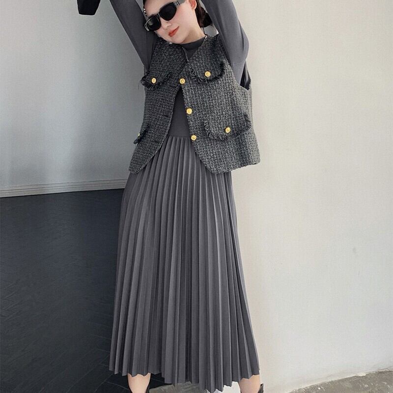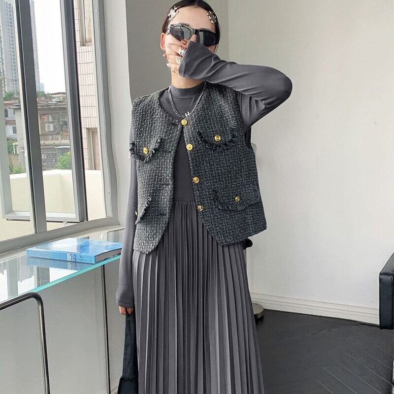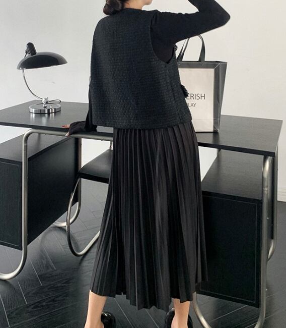 レディース ワンピース ベスト ミモレ 袖なし 長袖 レギュラースリーブ ノーカラー ハーフネック スリム 細身 Aライン フェミニン プリーツ ポケット 前開き ボタン ツイード ポリエステル繊維 大人可愛い シンプル 上品 おしゃれ 個性的 エレガント 存在感 都会的 無地 秋 ロングシーズン 発表会 授業参観 会議 ミーティング オフィス ビジネス OL 通勤 お出かけ イベント リゾート 旅行 女子会 休日 ショッピング 発表会 コンサート 重ね着 普段使い トレンド S M L XL