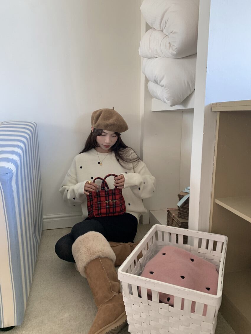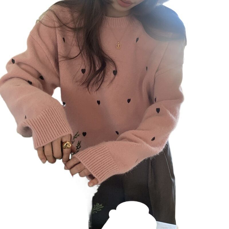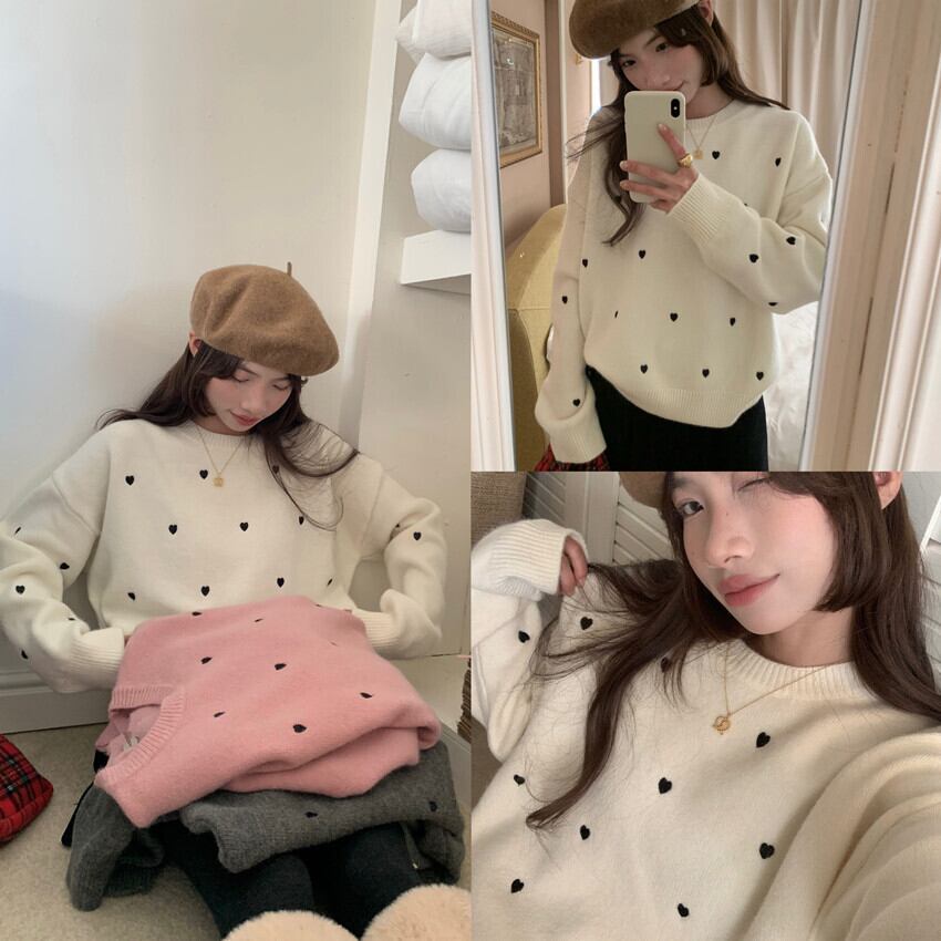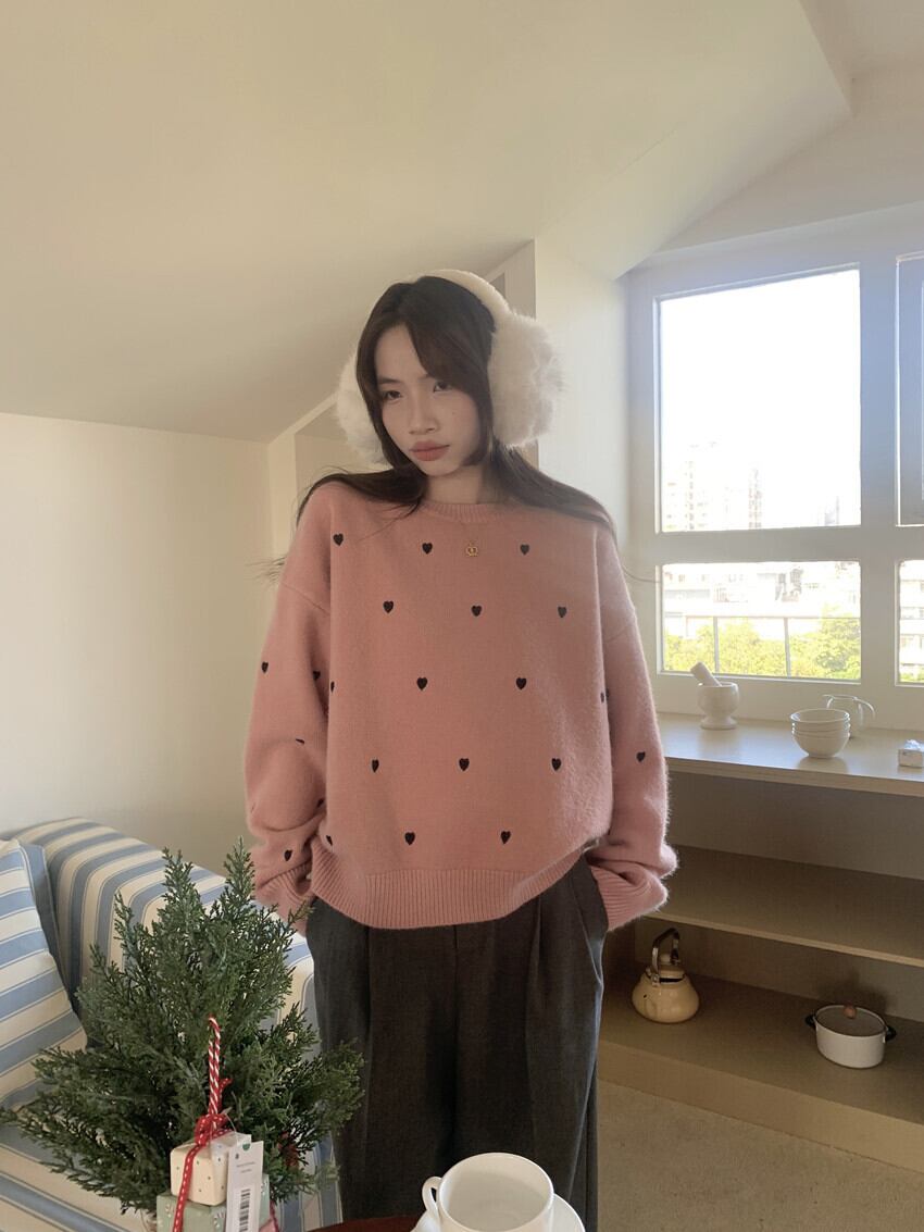 ゆったりとしたオーバーサイズの本セーターは、フェミニンなリブニットデザインで、ラウンドネックが顔周りをすっきりと見せてくれます。カジュアルなスタイルから、街のお出かけまで幅広く活躍すること間違いなしです!心温まる秋冬の季節にぴったりな存在感あるハート柄が、あなたのコーディネートをさらに可愛らしく引き立てます。