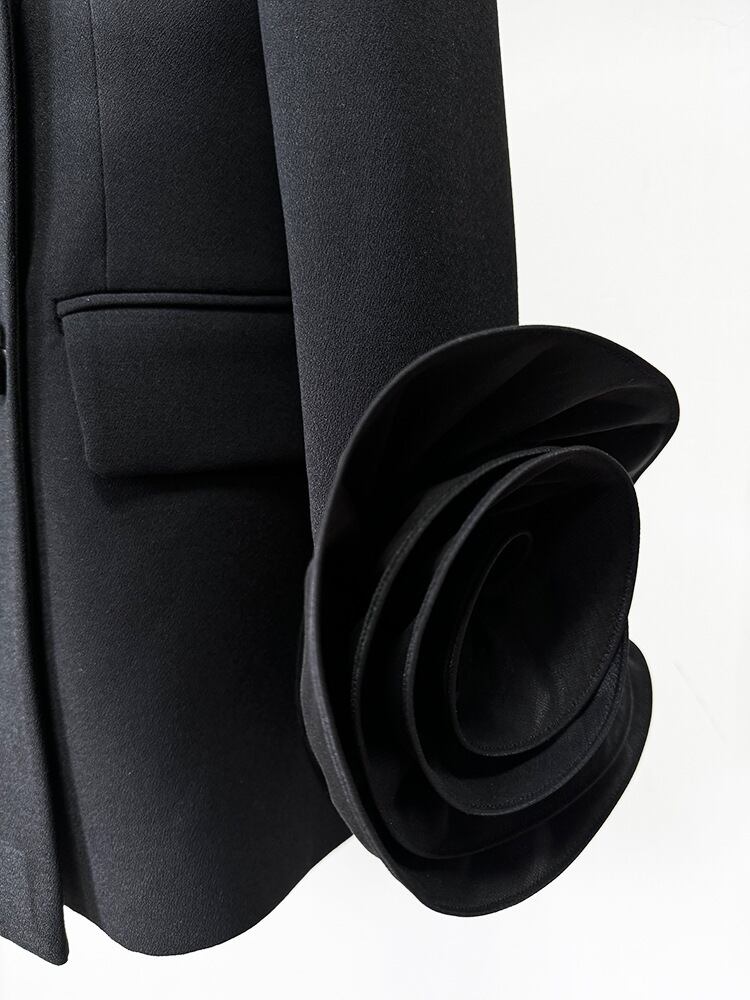 袖口の立体ローズデザインが目を惹く、大人女性にふさわしい華やぎジャケットです。