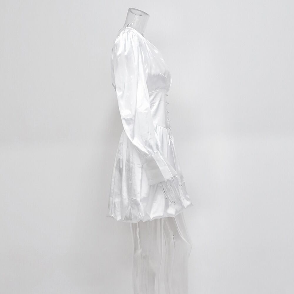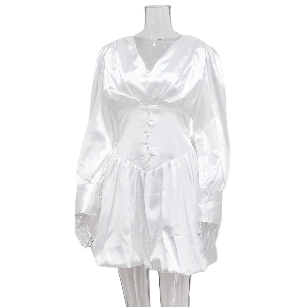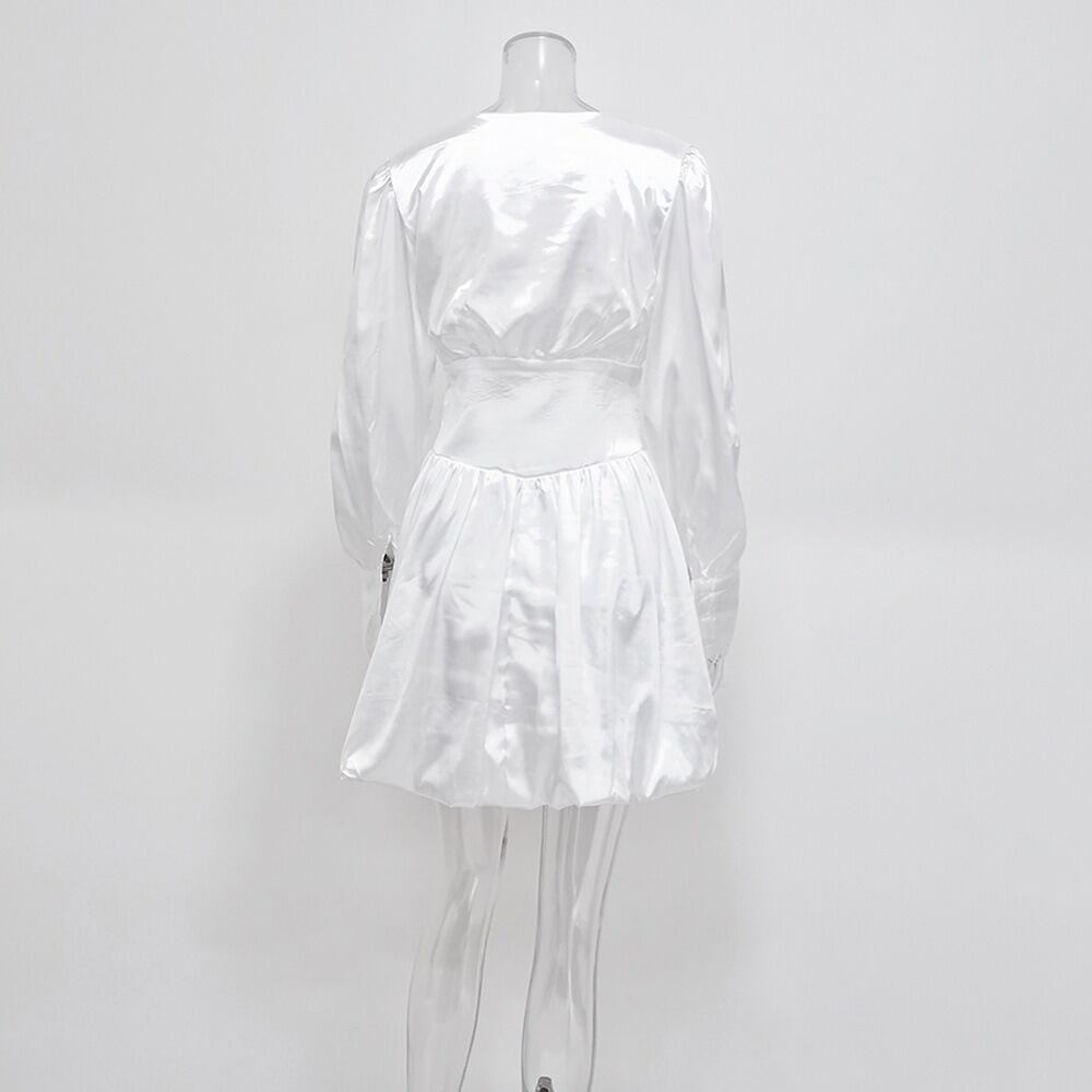 ドレス ワンピース パーティー 二次会 演奏会 発表会 ステージ 舞台 フォーマル キャバ 衣装 演劇 ラウンジ クラブ ショート 長袖 Vネック ファスナー ハイウエスト サテン 可愛い きれいめ カジュアル 大人可愛い おしゃれ かっこいい ガーリー クール 存在感 セクシー 無地 イベント 旅行 ホテル レストラン 韓国 美脚 脚長 女子会 光沢感 春 秋 S M L ホワイト
