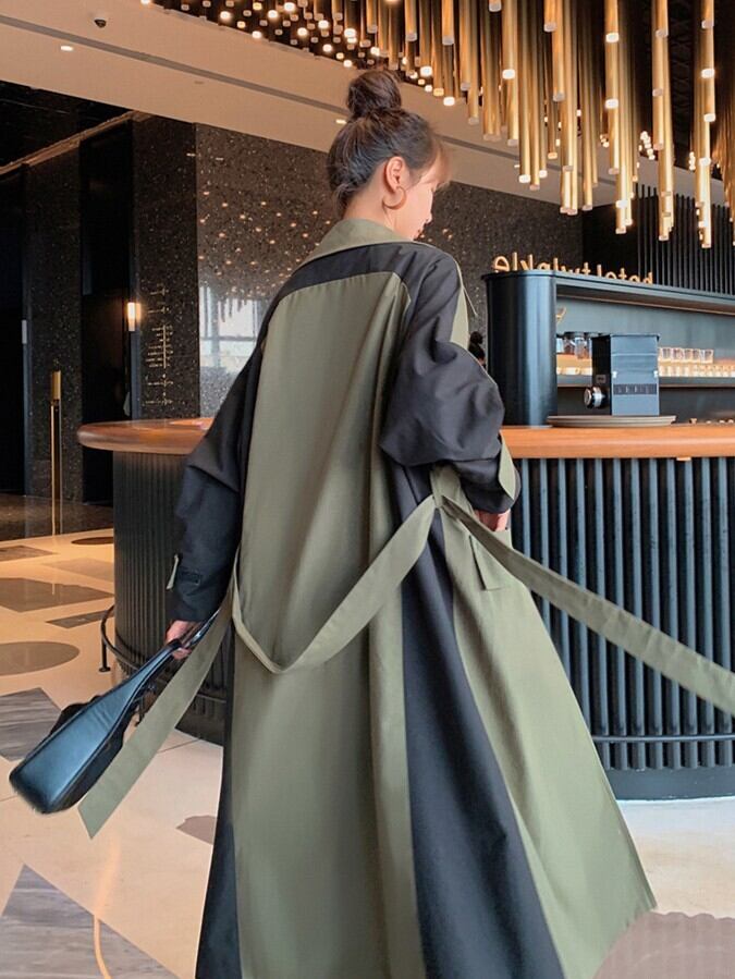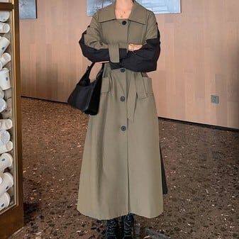 落ち着いたカーキ×ブラックのバイカラーが印象的な、大人モードなロングジャケット。