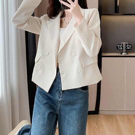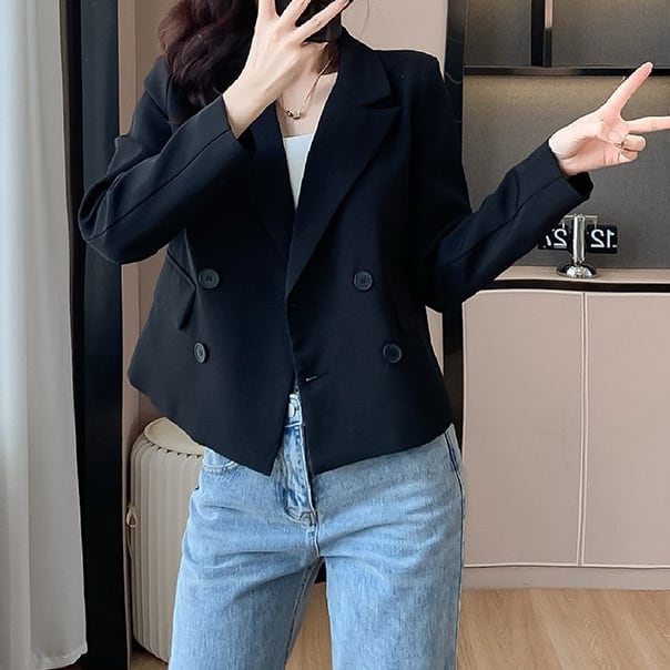 トレンド感のあるショート丈で、品のあるダブルブレストデザインが特徴的です。