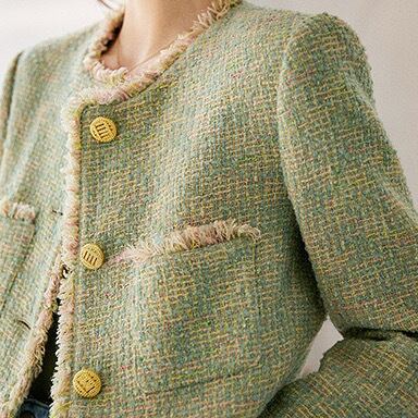 レディース トップス ジャケット 上着 羽織 前開き ノーカラージャケット ショート 長袖 ラウンドネック スリム ストレート フォーマル フェミニン ポケット ツイード コンサバ ボタン フリンジ 大人可愛い きれいめ 上品 おしゃれ かっこいい レトロ 個性的 エレガント 存在感 抜け感 ヴィンテージ クラシカル 春 秋 冬 入学式 入園式 卒業式 卒園式 授業参観 ママ 30代 40代 オフィス OL 通勤 デート パーティー レストラン ホテル ショッピング コーデ S M L XL グリーン 緑