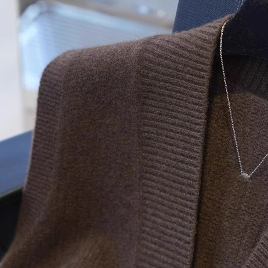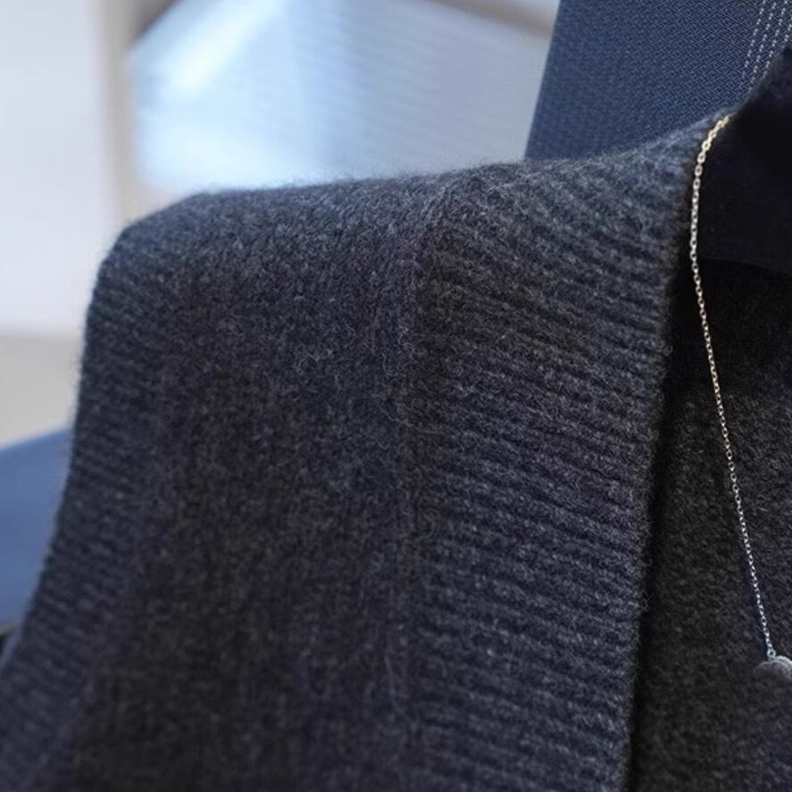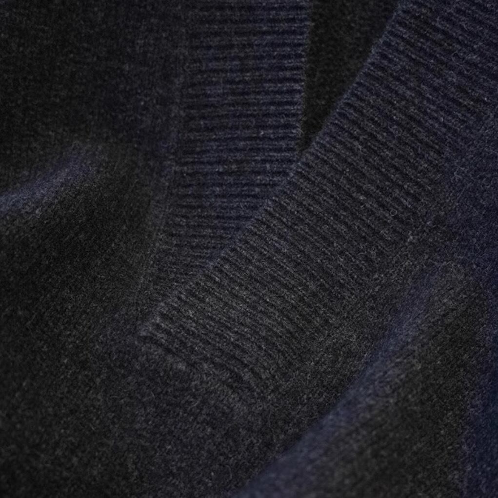 深めのVネックデザインが引き立てる、スタイリッシュでシックな印象のアイテムです。