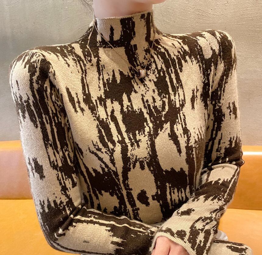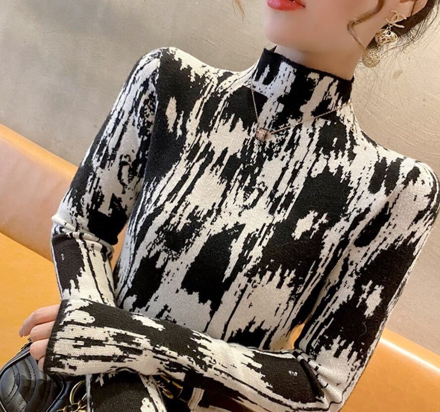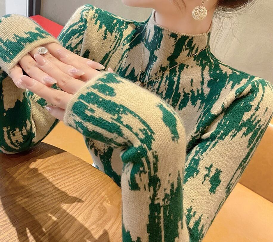 ペイント柄 レディース トップス セーター 長袖 ハイネック 襟なし タイト スリム 細身 かわいい 大人可愛い カジュアル おしゃれ ガーリー 存在感 ラブリー キュート ナチュラル 総柄 秋 冬 ママ 通勤 学生 学校 通学 デート お出かけ 旅行 レストラン 公園 女子会 休日 ホテル ショッピング カフェ 暖かい 普段使い 着回し S M L XL ブラック グリーン 大人カラー 秋カラー