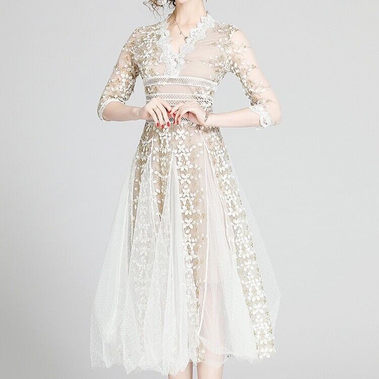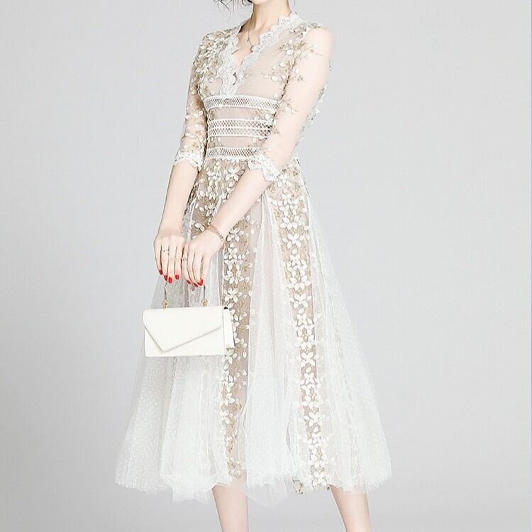 ドレス ワンピース ウェディング パーティー 結婚式 二次会 披露宴 演奏会 発表会 ステージ 舞台 フォーマル ロング 7分袖 Vネック レース 刺繍 ハイウエスト 可愛い きれいめ 大人可愛い 上品 おしゃれ かっこいい ガーリー クール エレガント 存在感 セクシー ホテル レストラン 韓国 美脚 脚長 女子会 春 夏 秋 冬 シーズンレス 2XL 大きい S M L XL ブラック オフホワイト