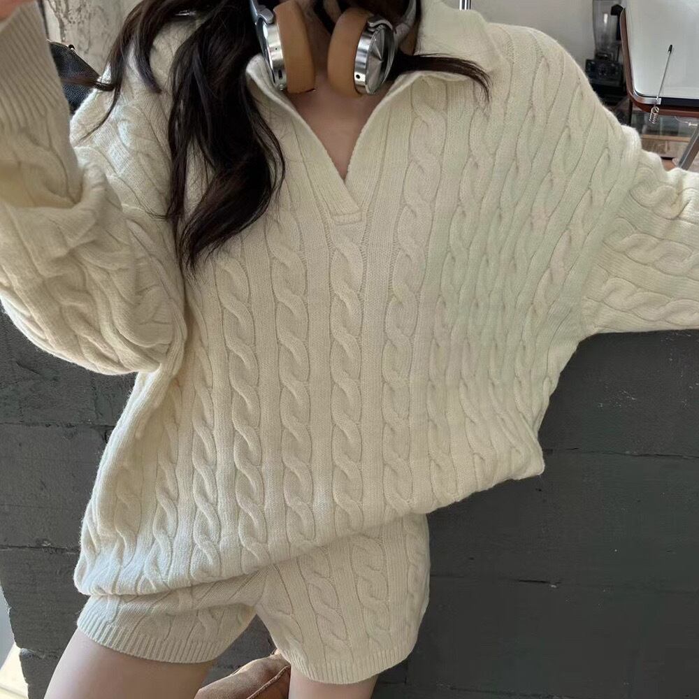 レディース トップス パンツ ボトムス ニット セーター プルオーバー セットアップ ショートパンツ ショート レギュラー丈 長袖 ドロップショルダー 萌袖 Vネック 襟付き ポロカラー フェミニン ハイウエスト リブ ウエストゴム ケーブルニット 伸縮性 シンプル カジュアル おしゃれ こなれ感 ラフ ルーズ 抜け感 無地 秋 冬 10代 20代 30代 40代 お出かけ 休日 ショッピング コーデ 楽ちん 暖かい 脚長 普段使い 着回し ゆったり ゆる フリーサイズ 黒 ブラック グレー ベージュ