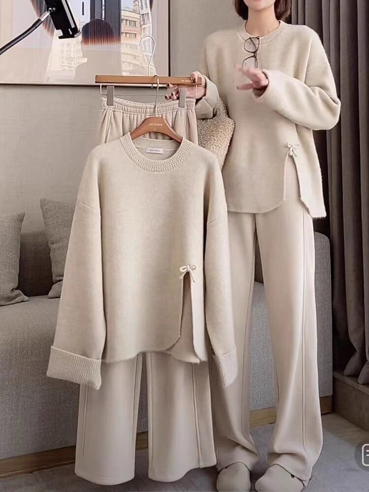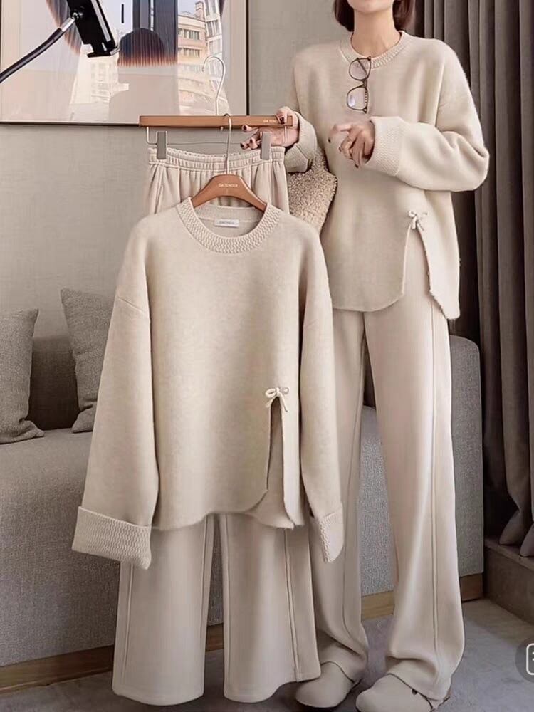 レディース トップス パンツ ニット セーター セットアップ ワイドパンツ 丈長 長袖 ボリューム袖 クルーネック ワイド オーバーサイズ リボン スリット サイドスリット ウエストゴム かわいい 大人可愛い シンプル カジュアル おしゃれ ラフ ガーリー ラブリー キュート ベーシック ナチュラル 無地 秋 冬 ママ 学生 学校 通学 デート お出かけ 旅行 女子会 休日 ショッピング カフェ コーデ 楽ちん 暖かい 体型カバー 普段使い 着回し M L XL 2XL 3XL 4XL 大きいサイズ ゆる
