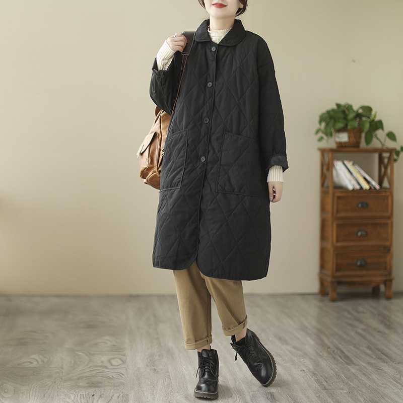 レディース コート キルティングコート 綿ジャケット ミモレ 長袖 レギュラースリーブ ポロカラー ワイド ストレート オーバーサイズ シングルブレスト 前開き キルティング 厚手 コットン シンプル カジュアル おしゃれ レトロ ナチュラル 無地 冬 オフィス ビジネス OL 通勤 お出かけ イベント 旅行 公園 女子会 休日 ショッピング 暖かい 防寒 体型カバー 普段使い M L XL 2XL 3XL 4XL ゆったり 黒 カーキ