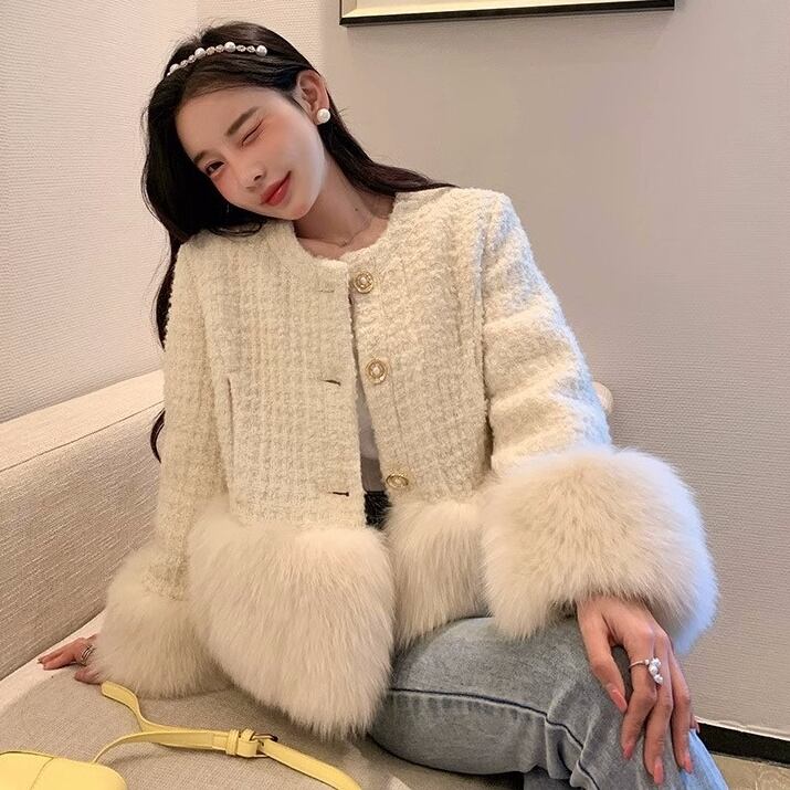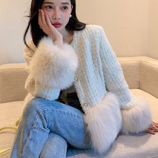 ラウンドネックと前開きのデザインは上品さを感じさせ、フェイクファーのポケットが可愛さをプラスします。