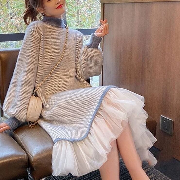 長袖とボリューム袖が特徴的で、ハイネックと裾フリルのレースが魅力を引き立てます。