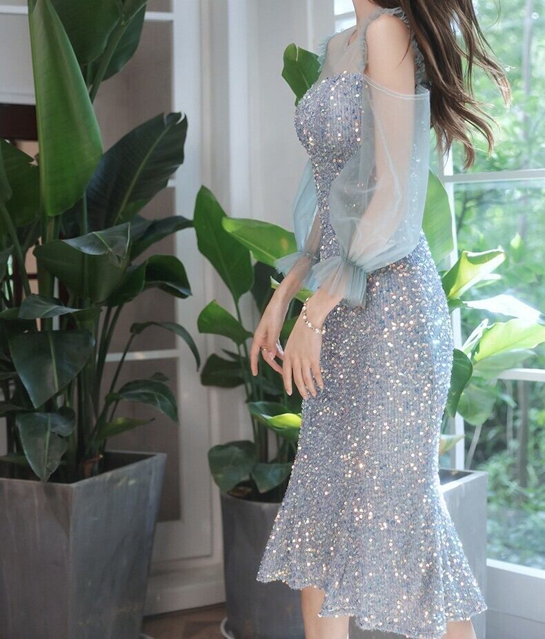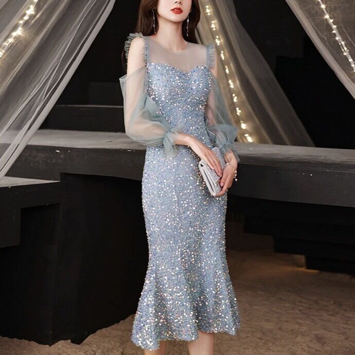 ドレス ワンピース ウェディング パーティー 結婚式 二次会 披露宴 演奏会 発表会 ステージ フォーマル キャバ ラウンジ クラブ ミディアム丈 長袖 パフスリーブ ラウンドネック ファスナー ハイウエスト 可愛い きれいめ 大人可愛い 上品 おしゃれ かっこいい ガーリー クール エレガント 存在感 ゴージャス 無地 ホテル レストラン 韓国 脚長 女子会 春 夏 秋 冬 シーズンレス 2XL 3XL 大きい S M L XL ブルー