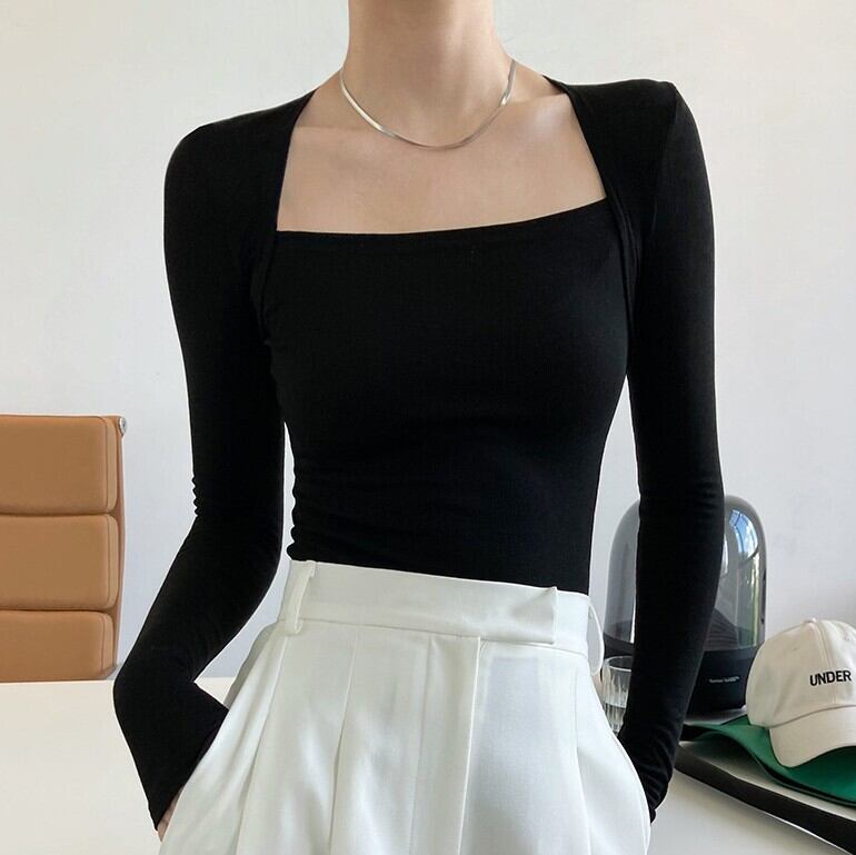 デコルテを美しく魅せるスクエアネックが印象的な長袖カットソー。程よくタイトなシルエットが女性らしさを引き立て、シンプルながらもこなれ感のあるスタイルに仕上がります。無地デザインなので合わせやすく、普段使いから特別なお出かけまで幅広く活躍します。