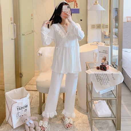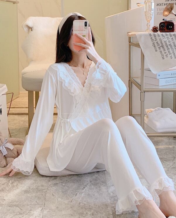 2点セット 上下セット レディース 部屋着 授乳着 産後 寝巻き 長袖 Vネック 襟なし ワイド フリル ウエストゴム 薄手 かわいい 大人可愛い シンプル カジュアル おしゃれ こなれ感 ラフ ガーリー ルーズ 主役級 存在感 ラブリー キュート 都会的 ベーシック ナチュラル 無地 春 夏 ロングシーズン お泊まり 休日 普段使い 着回し トレンド 流行 インスタ映え 定番 L XL 2XL ゆったり ホワイト グレー ベーシックカラー 大人カラー カラバリ