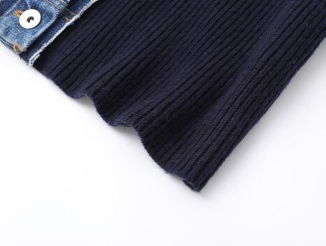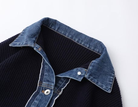 デニムとニットの切り替えデザインが施されており、シンプルながらも個性的な印象を与えます。