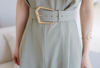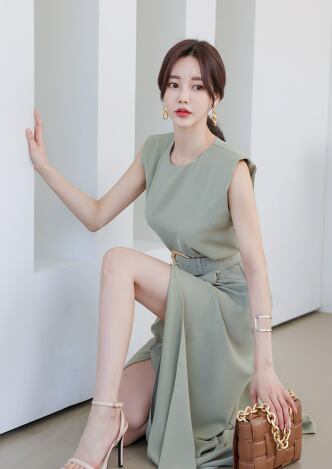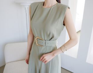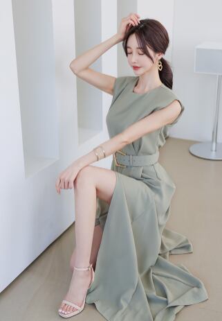 Uネックの袖なしスタイルに、Aラインのシルエットとサイドスリットが組み合わさり、上品さとおしゃれさが際立ちます。