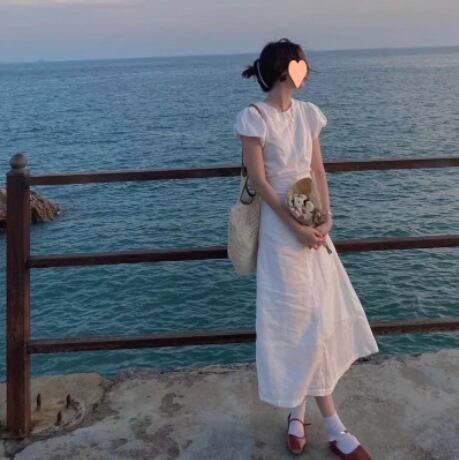 レディース ワンピース ミモレ ロング 半袖 パフスリーブ ラウンドネック フレア Aライン フェミニン バックリボン ドロスト 背中開き 肌見せ コットン かわいい 大人可愛い シンプル カジュアル 上品 おしゃれ こなれ感 ガーリー 主役級 抜け感 ロマンティック ナチュラル ヘルシー 無地 春 夏 秋 ロングシーズン ママ マタニティ デート お出かけ パーティー リゾート 旅行 公園 カフェ 韓国 コーデ 楽ちん 体型カバー 清楚 トレンド インスタ映え 定番 高見え S M L XL ホワイト