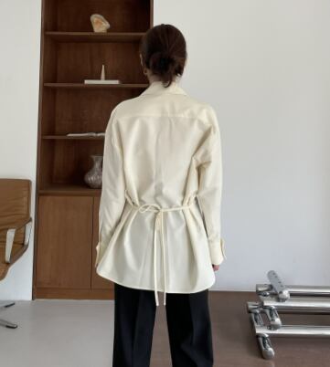 襟付きの角襟デザインが特徴的で、シンプルながらも上品な印象を与える一着です。