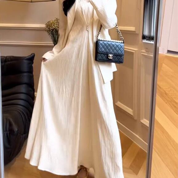 マキシフレアのワンピースは、ゆったりとしたシルエットが特徴で、シボ感のある素材がこなれ感を醸し出します。
