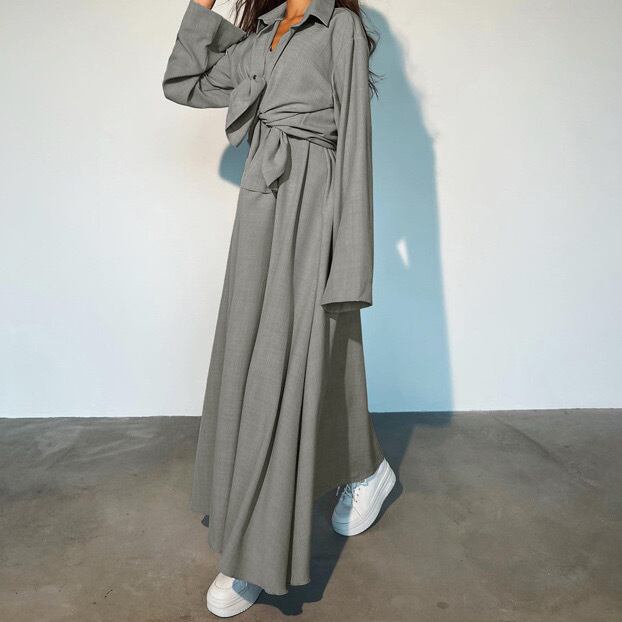 レディース スカート ジャケット ワンピース シャツ セットアップ アンサンブル シャツワンピ フレア 羽織 フレアスカート ロングスカート ロング 長袖 萌袖 襟付き Aライン ドレープ セパレート 大人可愛い シンプル 上品 おしゃれ かっこいい こなれ感 ルーズ 個性的 クール エレガント 主役級 存在感 都会的 シック 無地 春 秋 20代 30代 40代 デート お出かけ 女子会 休日 ホテル ショッピング カフェ モノトーン 重ね着 コーデ 体型カバー 普段使い 着回し S M L グレー
